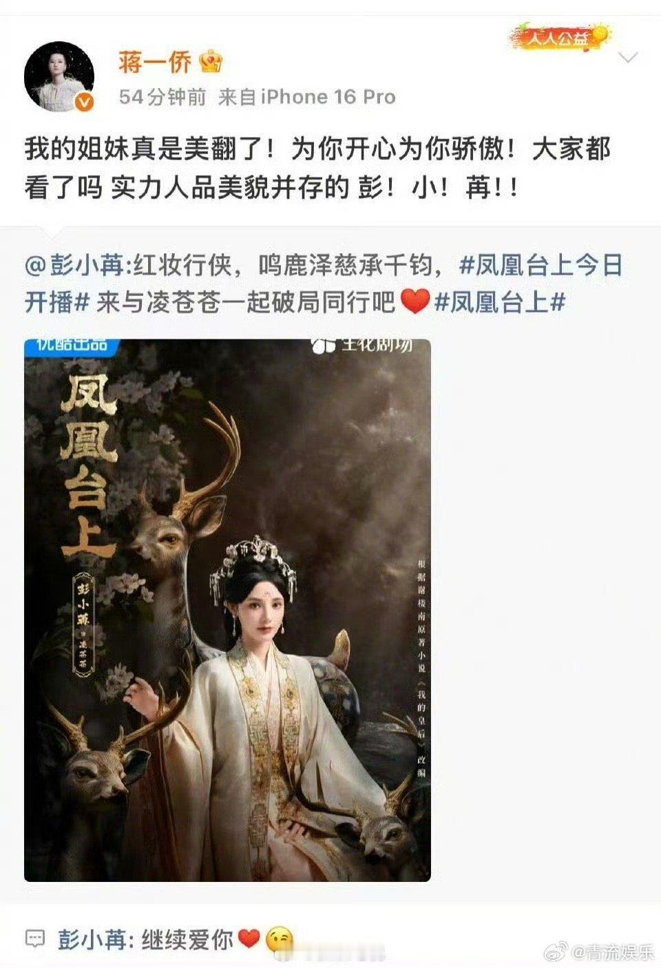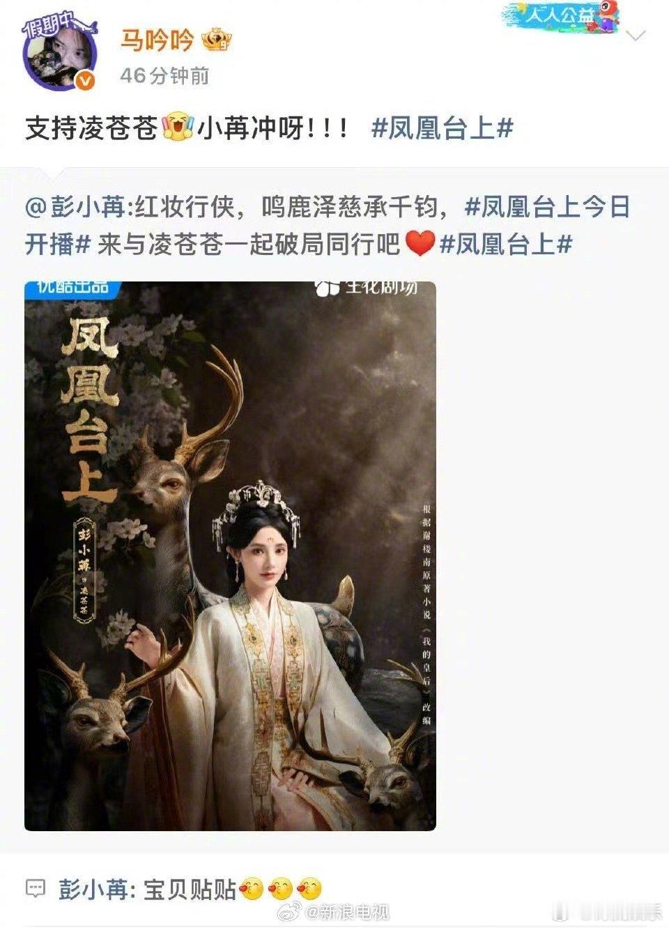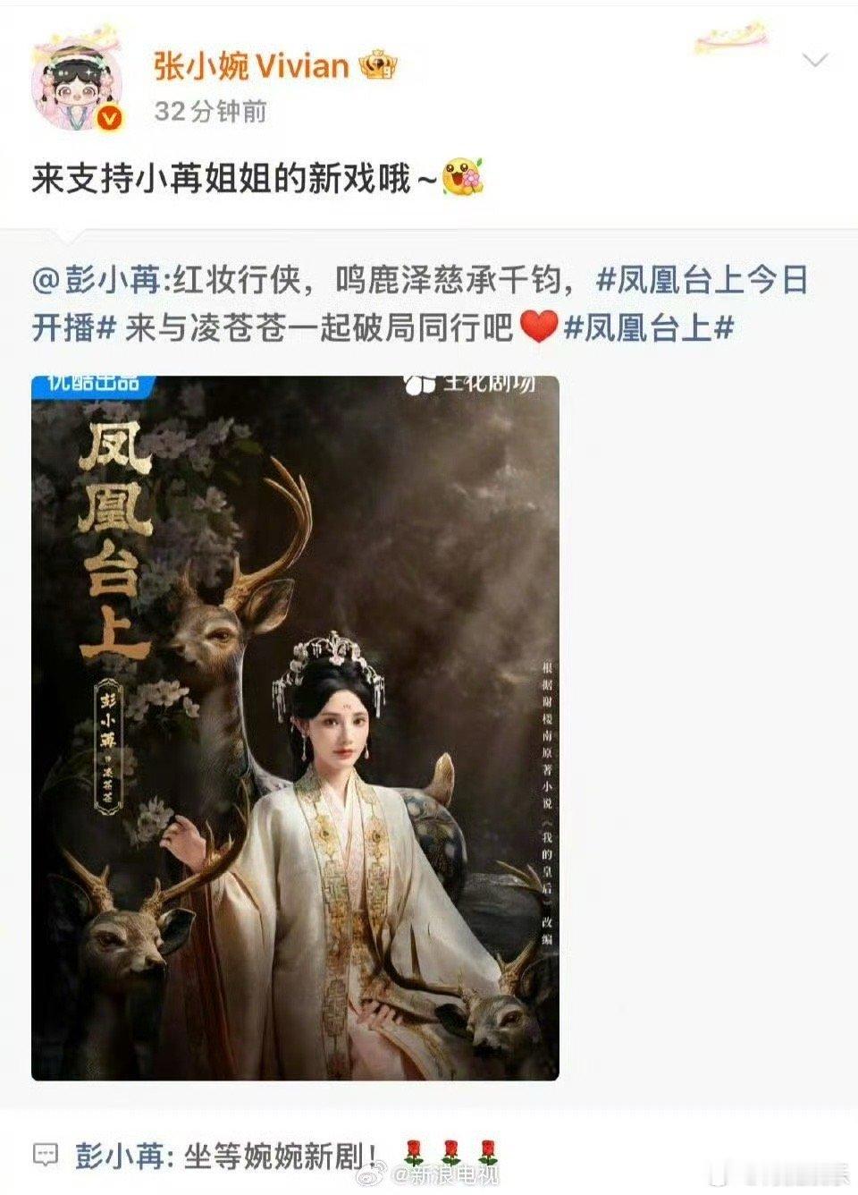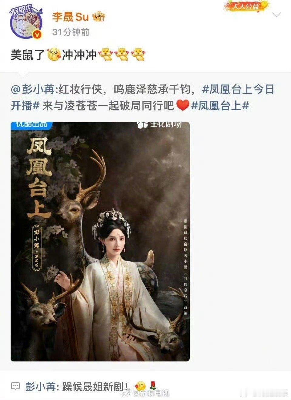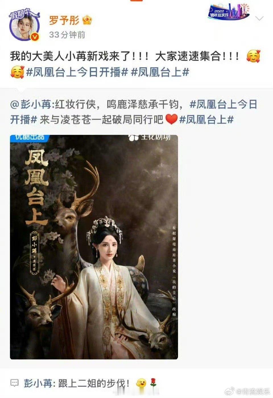 彭小苒新剧《凤凰台上》今日开播,浪姐6姐姐们在微博团建打call,罗予彤、李晟、