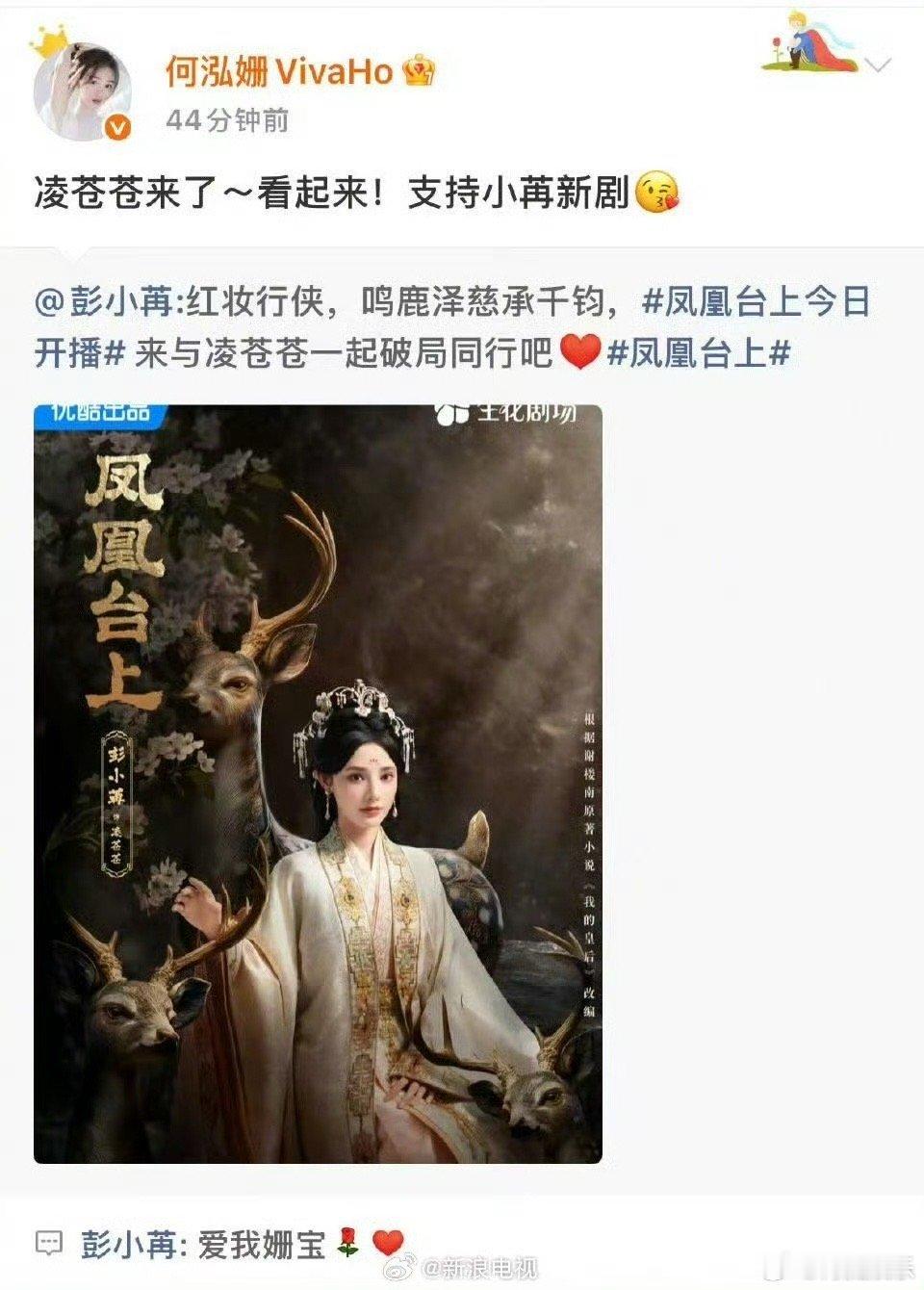 彭小苒新剧《凤凰台上》今日开播,浪姐6姐姐们在微博团建打call,罗予彤、李晟、马吟吟、蒋一侨、蒋梦婕、张小婉、宋妍霏、VAVA等都来了,好热闹!一起来看凌苍苍吧!