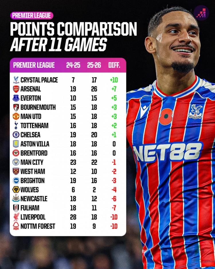 直播吧11月14日讯Opta统计了英超球队本赛季前11轮比赛与上赛季同期积分的变化,并列出榜单,水晶宫+10分提升最大,阿森纳+7分,利物浦-10分。