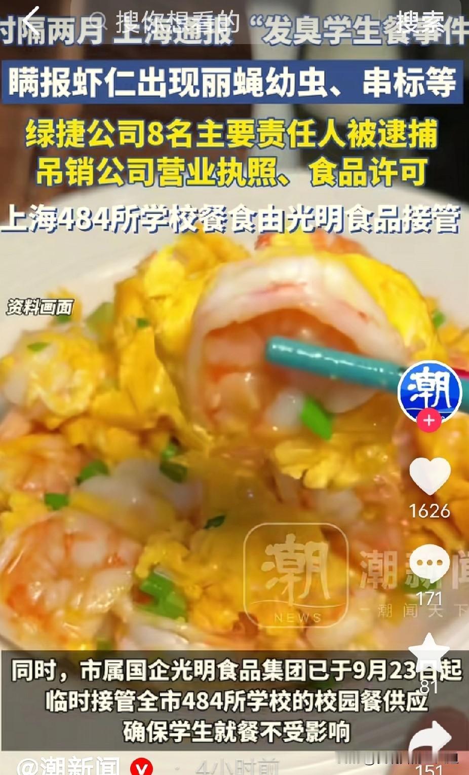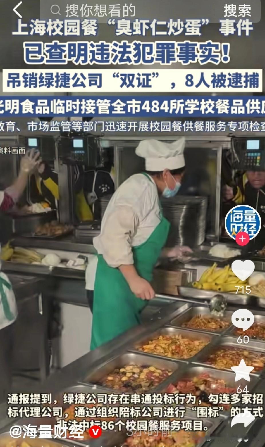 上海通报学校午饭发臭:8人被逮捕。 这事儿说起来真让人心里憋屈,孩子们在学校吃个午饭都能吃出虫子来,虾仁炒蛋愣是变成了“蛆仁炒蛋”。专家们鉴定说那是丽蝇幼体,说白了就是蛆,一想到这个画面就让人反胃。更可气的是,绿捷公司那帮人发现虫子后不是赶紧上报处理,而是偷偷删记录、换手机,对外还编瞎话说是“虾肠外溢”,这不明摆着欺负孩子小不会维权吗? 后厨监控拍到那盆虾仁的时候,厨师直接拎出来就下锅焯水,连自来水都舍不得冲一遍。孩子们围上来就闻见一股哈喇味,有个小姑娘捏着鼻子说“像臭鱼市场”,食堂阿姨赶紧把饭盒收走了。绿捷公司办公室里的聊天记录才叫精彩,主管吩咐下属“把手机格式化”,那边回复“早删干净了”,这熟练程度一看就是老手。其实前两年就有食堂经理反映豆芽发黏、鸡肉长霉点,全被上面压下来当成“正常损耗”。 查账本的审计员都气笑了——这家天天喊“营养均衡”的公司,居然靠着组织陪标演戏,硬生生骗到86个学校的饭堂承包权。招标文件上吹得天花乱坠的“全流程品控”,现实中变成用好处费买通假竞争对手的戏码。日供50万份学生餐的巨头,背地里连冷冻虾仁清洗程序都想省掉,后厨操作规范贴在墙上落满灰,还不如一张废纸有分量。 监管部门每学期的检查倒是准时打卡,可惜检查路线永远提前三天通知,绿捷公司连抹布都换成崭新的迎接检查。直到虫子捅到社交媒体上,才有人慌慌张张启动“应急机制”。要说最冤的还是接盘的光明食品集团,484所学校食堂突然砸过来,临时抽调三百个厨师加班补窟窿,热饭送到孩子手里都快成凉拌饭。 本文最想戳破的就是这种“稻草人监管”。罚单开得震天响,不如在厨房装个实时直播摄像头让家长扫码观看。绿捷公司能横行这么多年,那些在承包合同上签字的校长、盖章的教育局官员,哪个敢说自己是清清白白的看客?现在8个人被捕、公司吊销证照,看似雷霆手段,其实孩子们被祸害的午餐早已吃进肚子里。 各位读者你们怎么看?欢迎在评论区讨论。