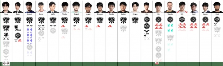 直播吧11月14日讯S15全球总决赛T1击败KT拿下第六冠并完成三连冠,赛后上单选手的荣誉图更新,前五选手均曾在T1/SKT担任过上单的选手,Zeus凭借两个S赛冠军仍旧位列上单位置第一。