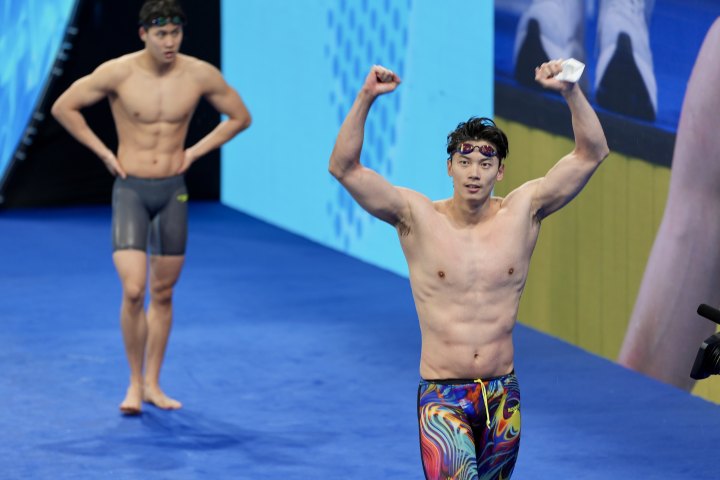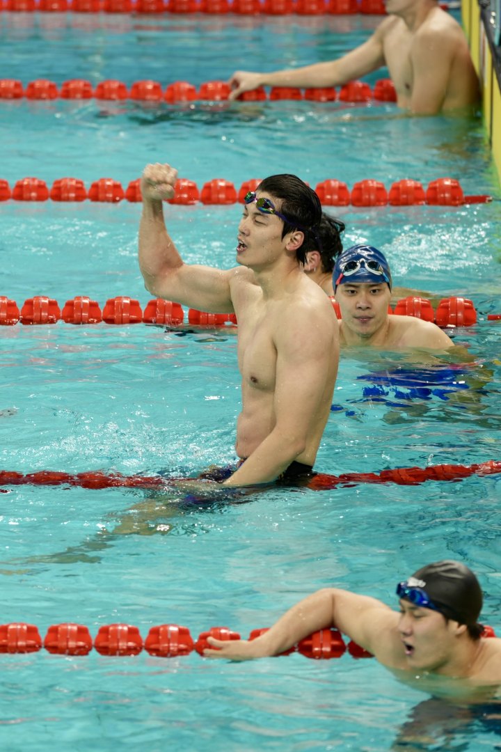 在男子200米混合泳决赛中,奥运冠军汪顺排在第4道出发,并以1分56秒20的成绩最终夺冠,收获本届全运会的第一枚个人项目金牌,完成在男子200米个人混合泳这一项目的全运会四连冠。