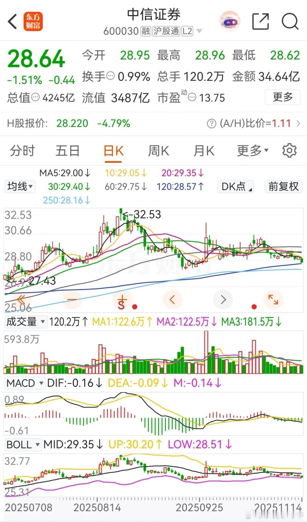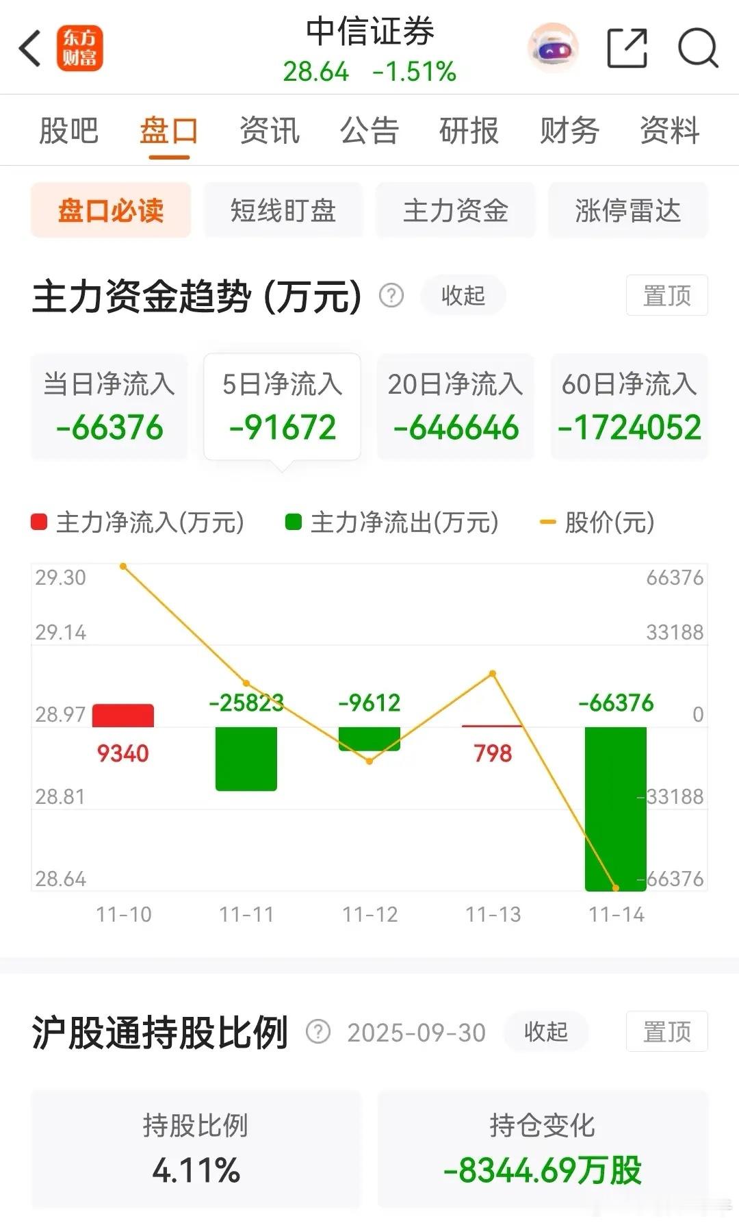 东方财富和中信证券今天低开低走,分别下跌了2.53%和1.51%,且都被主力大幅净卖出,这就是券茅和券商一哥今天的基本情况。东方财富今天低开后震荡走低,到了尾盘时加速下挫,收盘时跌幅达到了2.53%,报价为24.54元。在资金流向上,今天被主力资金大幅净卖出了8.3999亿元,近五个交易日则是被主力资金合计净卖出了 20.8566亿元。从走势上看,今天继续破位下跌,日线级别走势上股价已经达到了半年线支撑位处,而周线则是三连阴,目前已跌破了5、10和20周线。中信证券今天同样也是低开低走,尾盘时加速下行,截止收盘时,股价下跌了1.51%,收盘报价为28.64元。在资金流向上,今天被主力资金大幅净卖出了约6.6376亿元,近五个交易日则是被主力资金合计净卖出了约9.1672亿元,而近20个交易日则是合计净卖出了 64.6646亿元。从走势上看,中信证券同样也是破位下行,目前也是跌到了半年线支撑位置,周线同样也是连续三周收阴,走势和东财一样。东方财富和中信证券一个号称券茅,另一个号称券商一哥,但是行业角色却是分化的。中信证券是政策“压舱石”,慢牛中维稳指数,受益于政策红利(如并购重组、跨境投行)。而东方财富则是牛市“旗手”,高贝塔属性契合散户主导行情,AI投顾、社交化交易是突破点。