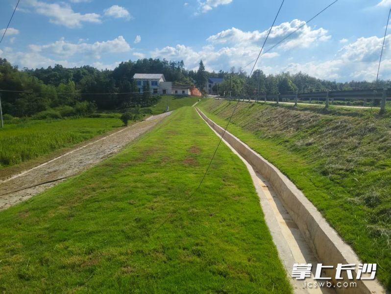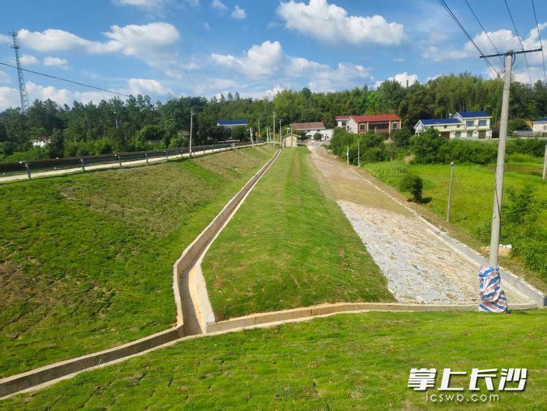 近日记者走进该村,发现该水库的大坝、溢洪道等设施均已修复好。绿油油的草皮铺设在水库堤坝上格外漂亮。