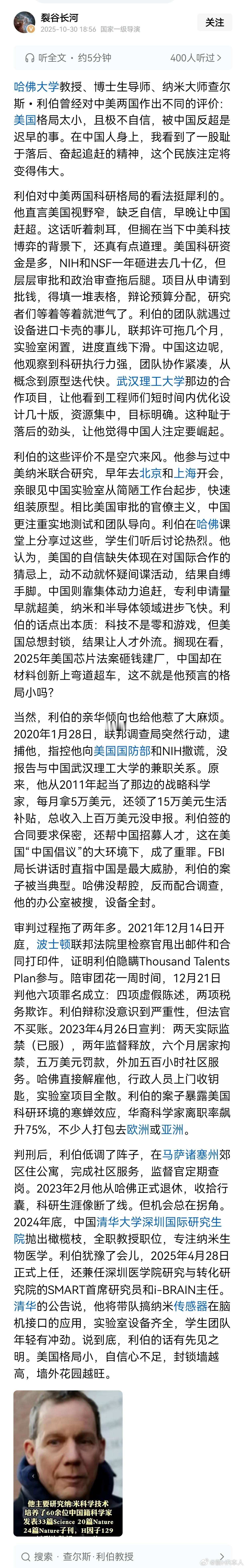 哈佛大学教授、博士生导师、纳米大师查尔斯•利伯曾经对中美两国作出不同的评价:美国格局太小,且极不自信,被中国反超是迟早的事。在中国人身上,我看到了一股耻于落后、奋起追赶的精神,这个民族注定将变得伟大。从哈佛大学离职后加入清华大学深圳研究院。这位教授被美国人认为亲华,因为带了几十名中国科学家成长。