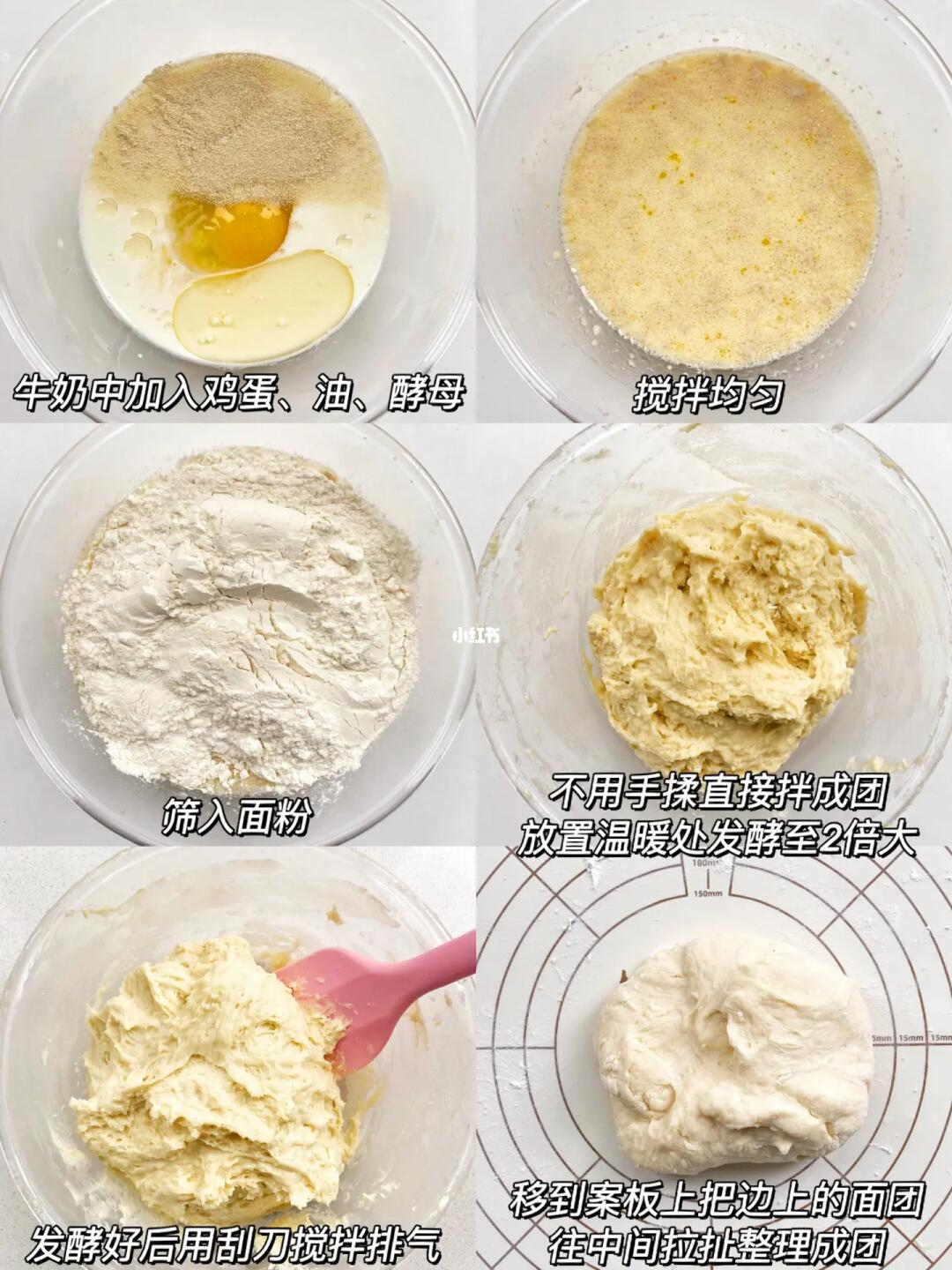 1⃣️牛奶中加入鸡蛋、油、酵母搅拌均匀。筛入面粉,搅拌成团,温暖处发酵至2倍大。