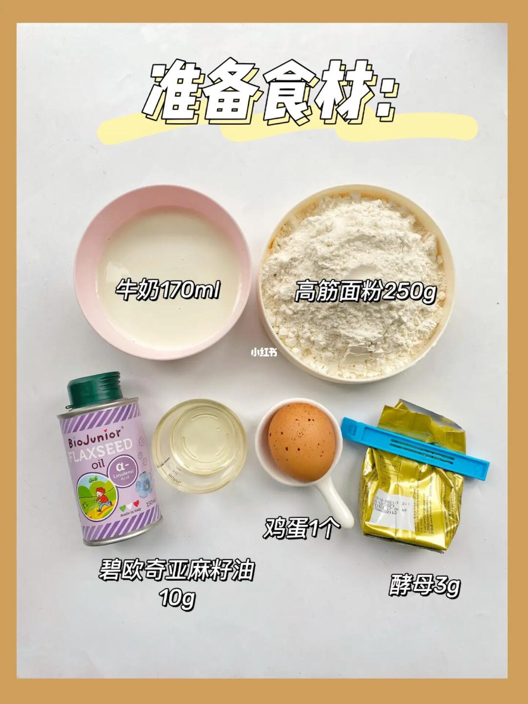 高筋面粉250g、牛奶170ml、碧欧奇亚麻籽油10g、鸡蛋1g、酵母3g、大宝宝吃可以再加15g左右的白糖