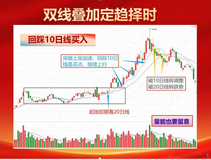 炒股有一个简单的方法,就是用双线叠加来判断股票的买点,通过10日线和20日线来判断股票的强势程度和买点。1. 双线叠加定趋势 20日线是股票的生命线,只要是涨势结构基本都会在20日线上方运行,一旦跌破20日线就转为调整甚至进入下跌走势了。在起涨的初期回踩20日线是买点,震荡上升的时候调整回踩20日线是买点。2. 均线回调逢低买入 强势股调整幅度并不大,基本不会给到20日线的机会,小幅调整下又继续上涨新高,10日线成为重要的支撑,强势股回踩10日线是低吸的机会。3. 事不过三原则 针对生命线,也就是在回踩20日线超过3次了,其效用会大大降低,尤其是要注意会跌破均线向下运行。总之,炒股需要结合均线、成交量等多个因素来判断股票的买点和强势程度,不能生搬硬套。