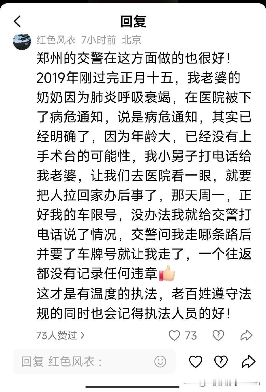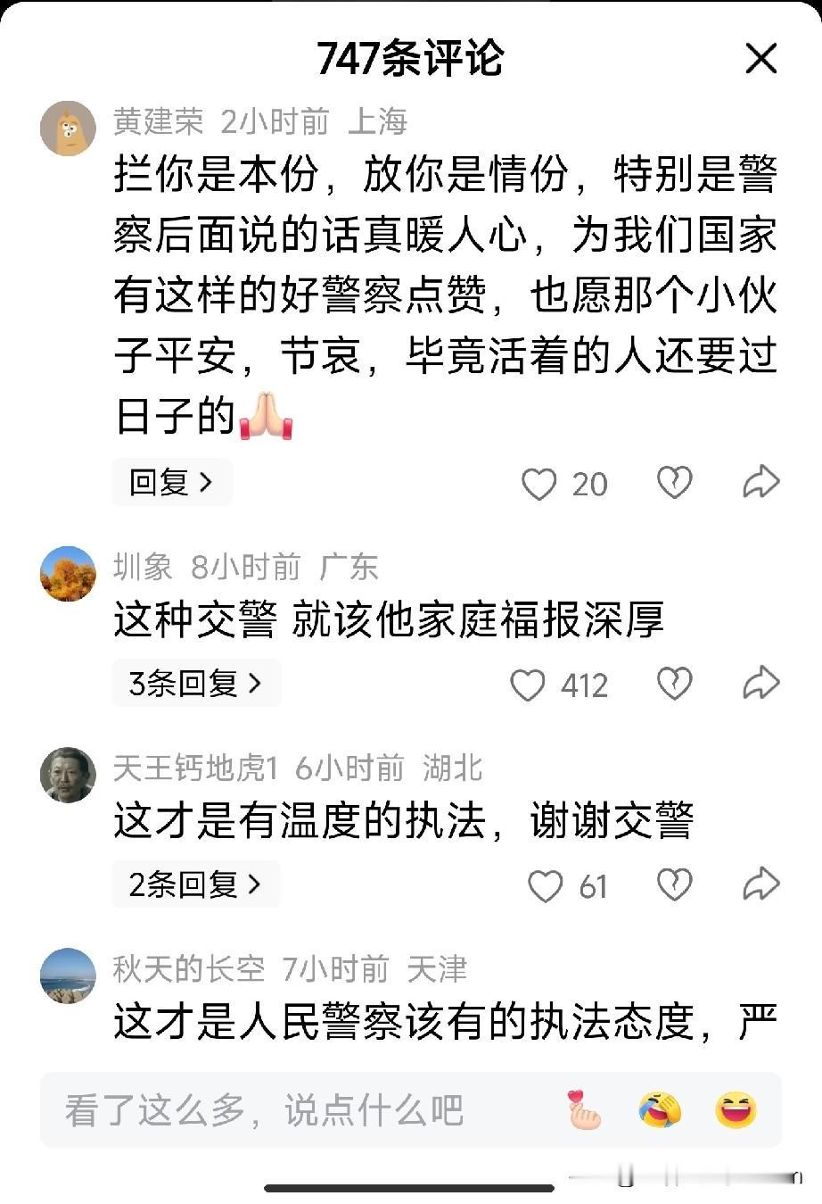看到这个新闻,瞬间破防了。 11月13日,北京一位男子因母亲突然离世,情急之下骑着摩托车就上了环路。 正在执法的民警拦下了他。可听完原因后,民警没有开罚单,而是说了句:“节哀师傅,刚才不好意思耽误到您了。” 一句理解,胜过千言万语。 这条新闻下面,好多朋友分享了自己的故事。 一位网友说,疫情期间母亲去世,高速不让上。一位交警了解情况后,假装转身,让他上了高速。“这份善意,我一直记着。” 人生总有猝不及防的时刻。在这些特殊关头,一点点的理解和通融,真的能温暖一个人很久很久。 冰冷的规则之外,原来一直都有温度的流动。 执法要有原则,但更要有懂得人间疾苦的心。 为这样的民警点赞! 如果你也被温暖到,请点赞转发,让这份善意传递下去❤ (文章素材来自网络,侵删)