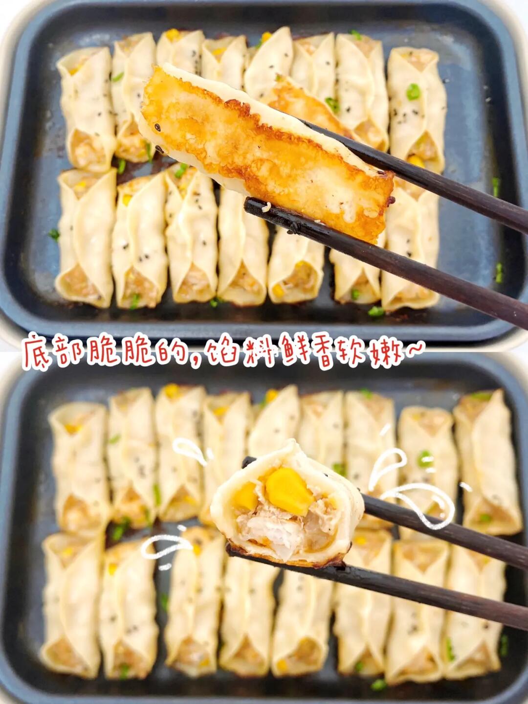 🌈答应我一定要要试试这个好吃的鲜虾猪肉玉米锅贴,玉米、虾仁、猪肉搭配起来的味道真的是绝了,底部酥脆,馅料软嫩多汁又鲜香,比饺子好吃一万倍呀❗️