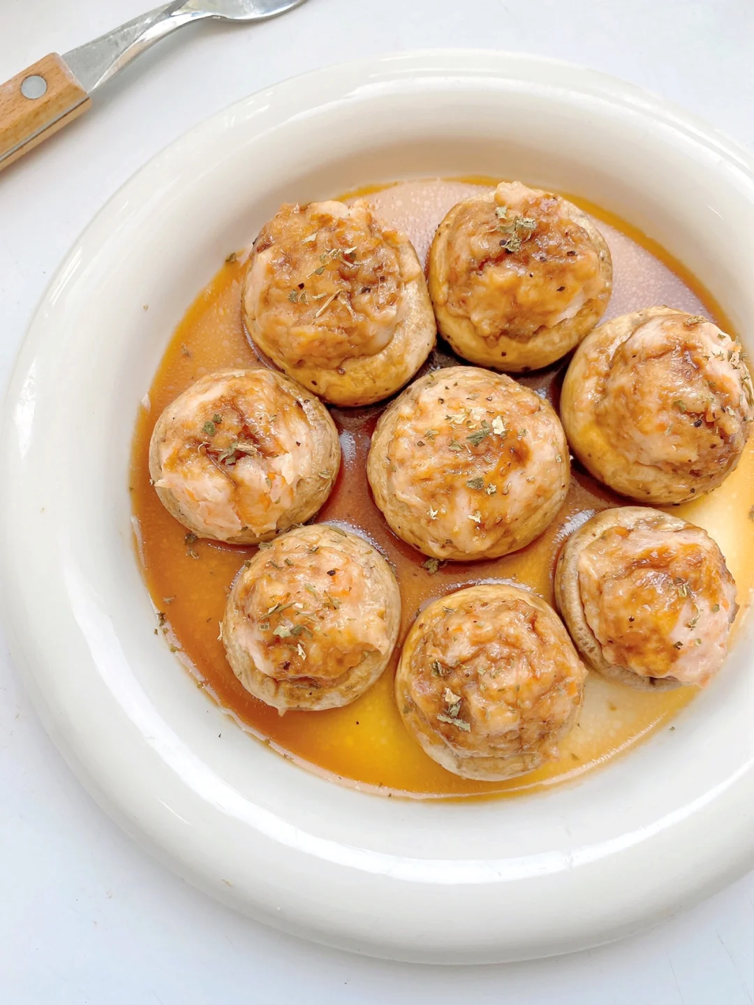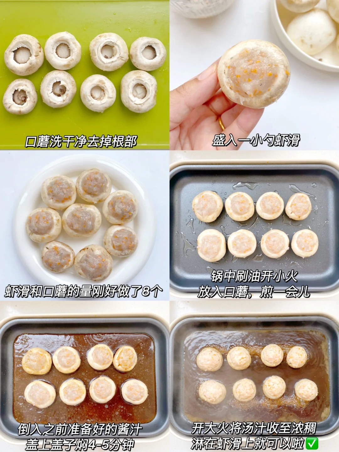 3⃣️口蘑去掉根部,填入虾滑。锅中刷油将口蘑煎一下,倒入酱汁,盖上盖子焖4-5分钟,再开大火将汤汁收至浓稠,淋在虾滑上就可以啦❗️