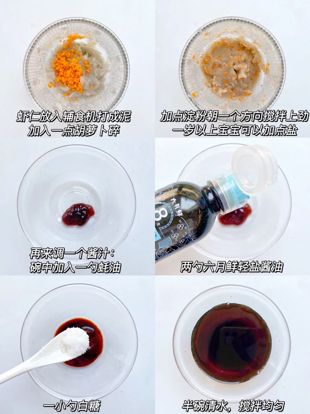 1⃣️虾仁放入辅食机打成泥,加入胡萝卜碎和一丢丢淀粉,朝一个方向搅拌上劲。