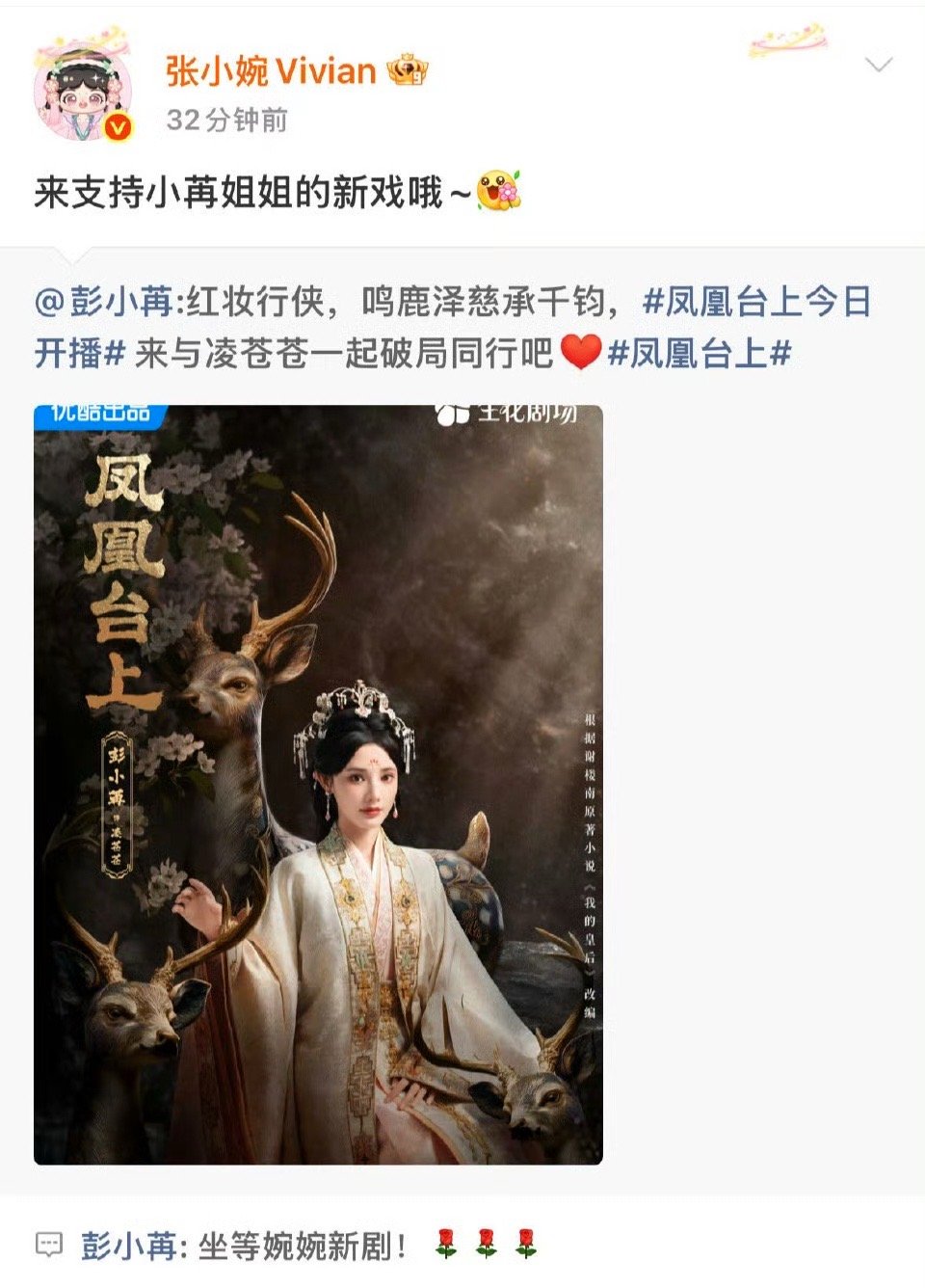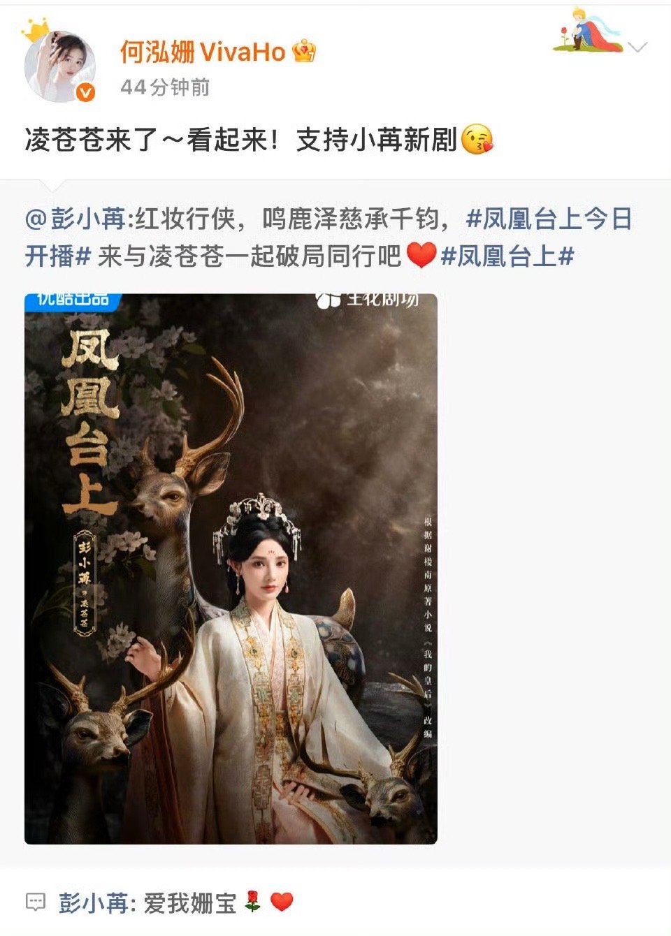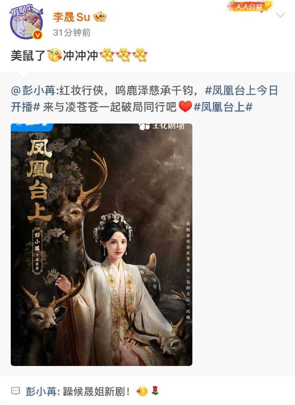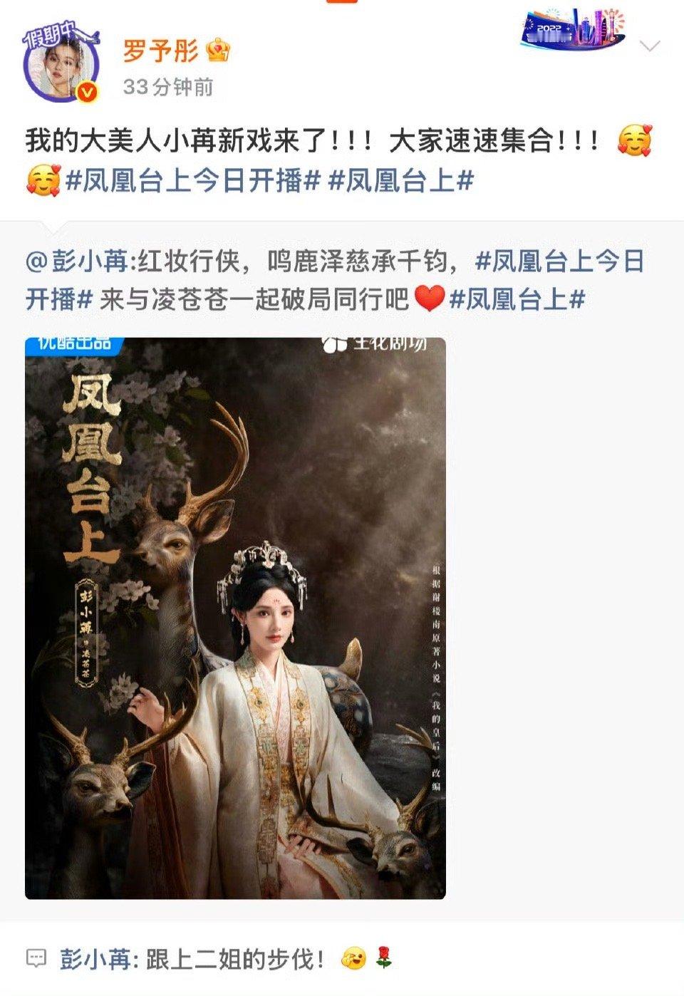 彭小苒新剧《凤凰台上》今日开播,浪姐6姐姐们在她微博评论区团建打call,罗予彤