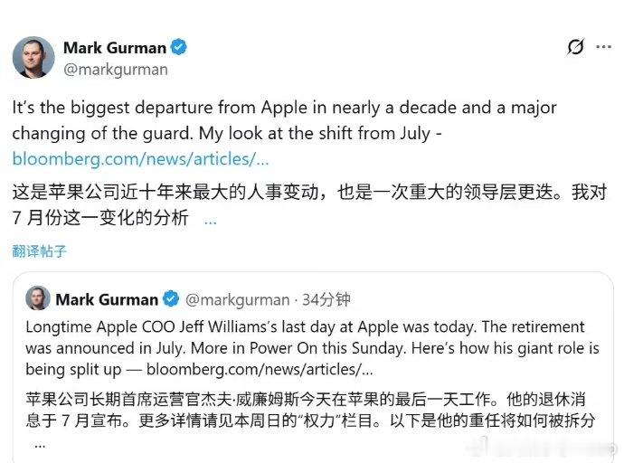 【】彭博社的马克・古尔曼(Mark Gurman)11 月 15 日在 X 平台发布推文,报道称苹果公司前首席运营官杰夫・威廉姆斯(Jeff Williams)今天已正式退休离职。今年 10 月报道,苹果前首席运营官(COO)杰夫・威廉姆斯(Jeff Williams)会于 2025 年底正式退休,其负责的多项关键业务已敲定相关交接。威廉姆斯自 2010 年起担任苹果 COO,其职位已交由萨比・汗(Sabih Khan)接任,近期明确了他此前负责的关键业务归属问题。苹果首席执行官蒂姆・库克对威廉姆斯给予了高度评价,他表示:“没有杰夫,苹果就不会是今天的样子。”库克强调,威廉姆斯不仅帮助苹果建立了全球最受尊敬的供应链之一,还主导了 Apple Watch 的推出与发展,并构思了公司的健康战略,以极大的智慧和热忱领导着设计团队。库克称,威廉姆斯留下的最宝贵遗产是他所创建的卓越团队。除了担任首席运营官,威廉姆斯还同时负责公司的客户服务与支持、设计团队、Apple Watch 的软硬件工程以及整体健康计划。随着他的退休,苹果已重新调整这些庞杂的职责。彭博社报道指出威廉姆斯原先掌管的多项业务已被分拆并移交给其他高管:健康(Health)与健身(Fitness)业务正式划归高级副总裁艾迪・库(Eddy Cue)领导的服务部门。负责 Apple Watch 操作系统的 watchOS 团队,则移交给软件工程高级副总裁克雷格・费德里吉(Craig Federighi)管理。Apple Watch 硬件业务则由硬件主管约翰・特努斯(John Ternus)接管。(IT之家)