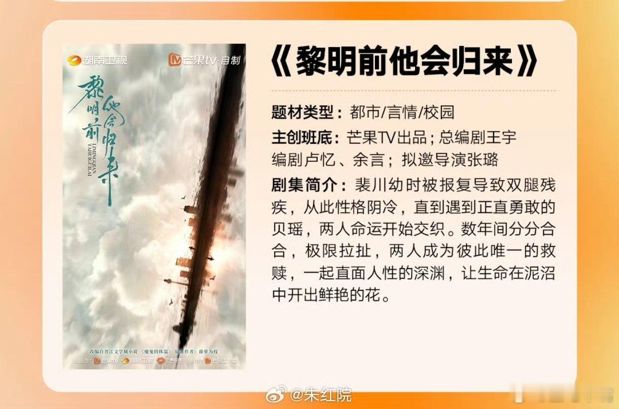 吃瓜🍉:湖南卫视现代偶像剧《黎明前他会归来》,领衔主演:张淼怡 毕雯珺(排名不分先后) 特邀领衔:翟潇闻领衔主演:鹤男 全伊伦 主演:丁笑滢改编自藤萝为枝小说《魔鬼的体温》开机时间:12月底 吃瓜🍉不信瓜