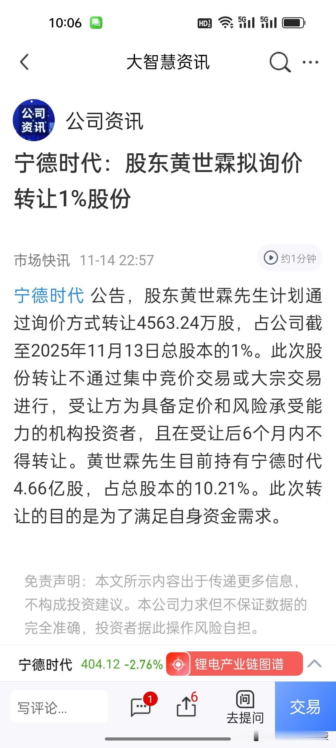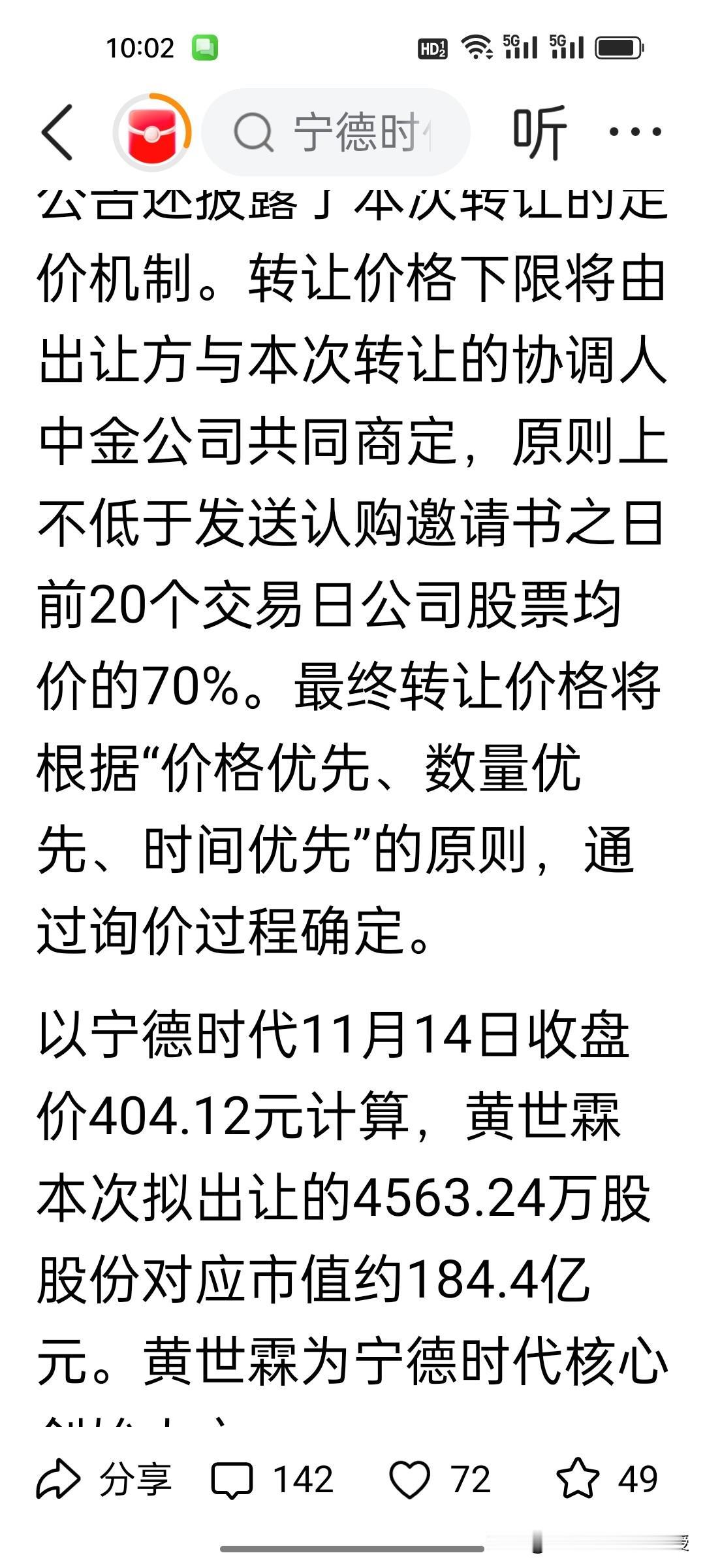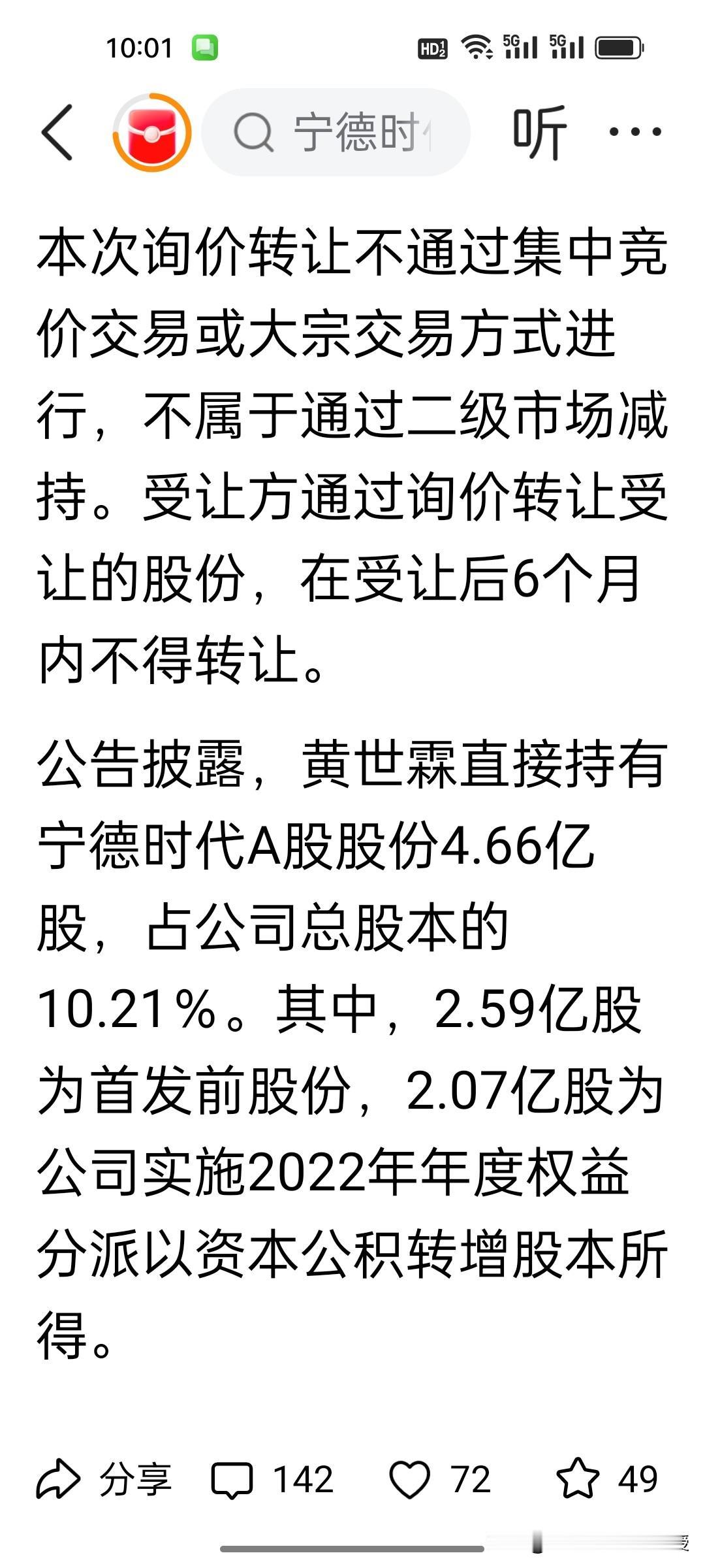 刚刚看到,宁德时代发公告称,其核心创始人黄世霖减持1%的股份,套现184.4亿,理由是个人资金需求。不知道他要拿184亿去投资什么?黄世霖之前共持有宁德时代10.2%的股份,对应市值近2000亿,此次在宁德时代的历史最高位减持套现,仅仅套现1%,就有184亿,这是不是意味着宁德时代股价已经到顶了呢?看到这个突发消息,很多投资者开始担心周一的电池板块走势了。