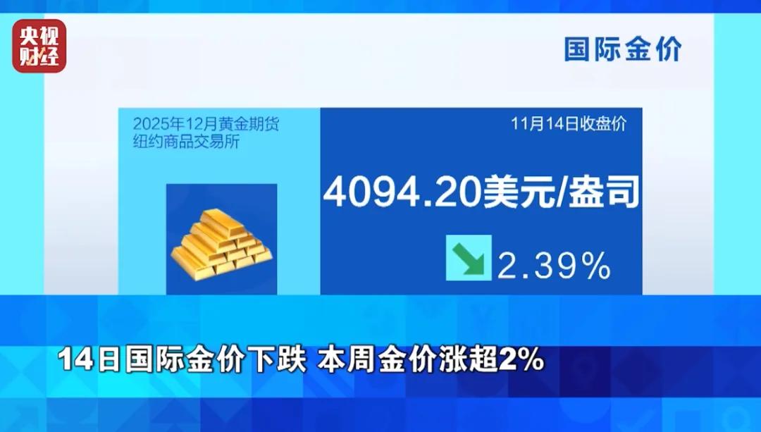 投资者对美联储降息的预期减弱拖累黄金价格下跌,截至收盘,纽约商品交易所12月黄金期价收于每盎司4094.20美元,跌幅为2.39%。不过,由于前期涨幅较大,本周国际金价累计上涨2.10%。