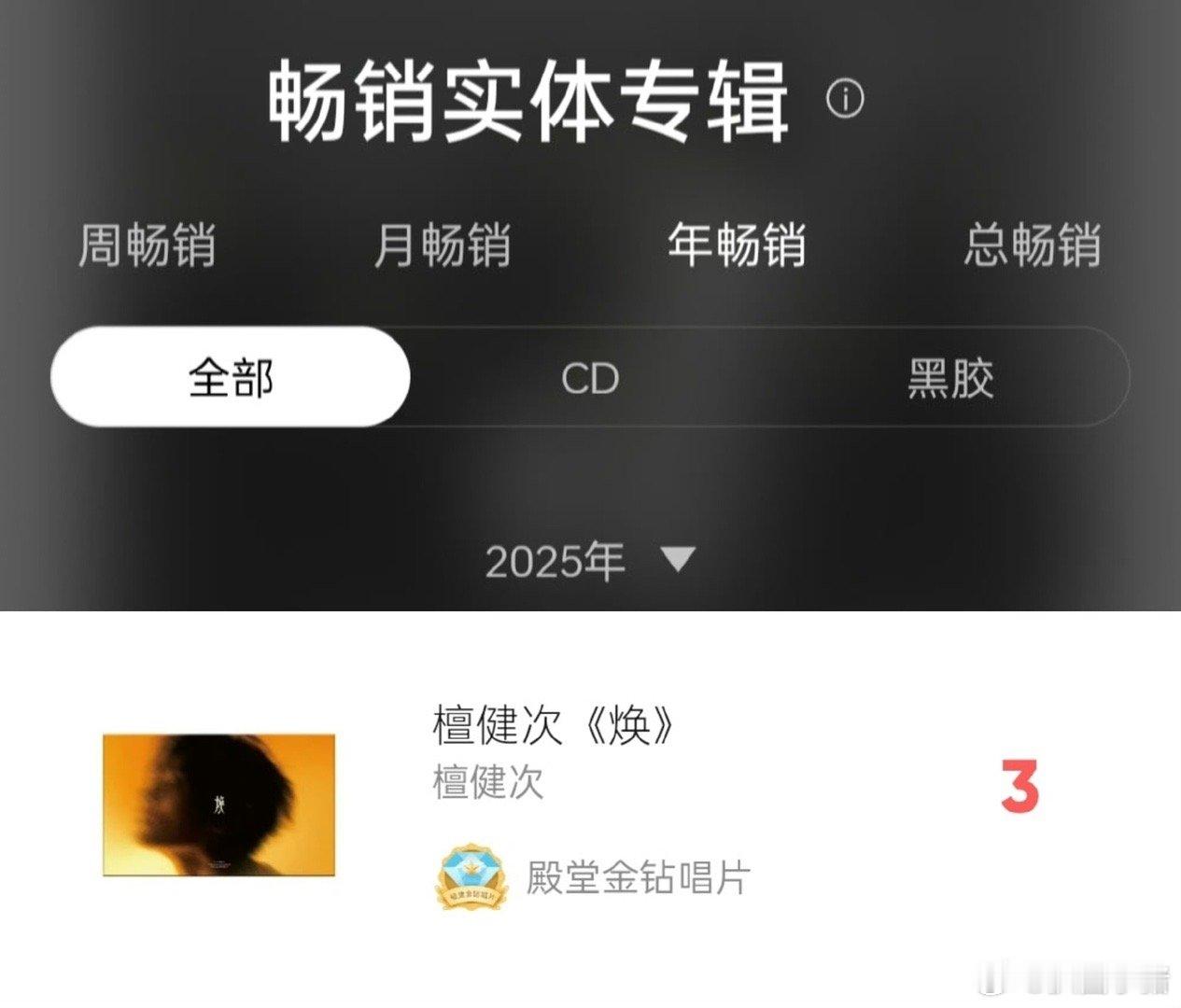 做了一个推算,肖战的专辑是2024年发布的,但2025年仍旧在实体专辑销售额排行