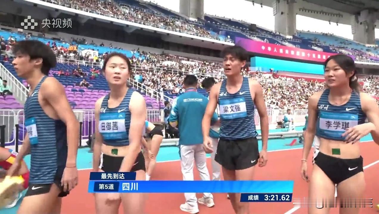 全运会田径4x400米混合接力,预赛前三: 第1名,河北队,3分21秒10,刷新PB; 第2名,广东队,3分21秒41; 第3名,四川队,3分21秒66,赛季最佳。 全运会田径4x100米混合接力,预赛前三: 第1名,福建队,40秒58,刷新PB; 第2名,广东队,40秒73,刷新PB; 第3名,广西队,40秒85,刷新PB。 山东队,4x400混合接力成绩3分22秒64,创造赛季最佳成绩,以预赛第六名晋级决赛。山东4x100混合接力队成绩41秒78,预赛第九名,无缘决赛。