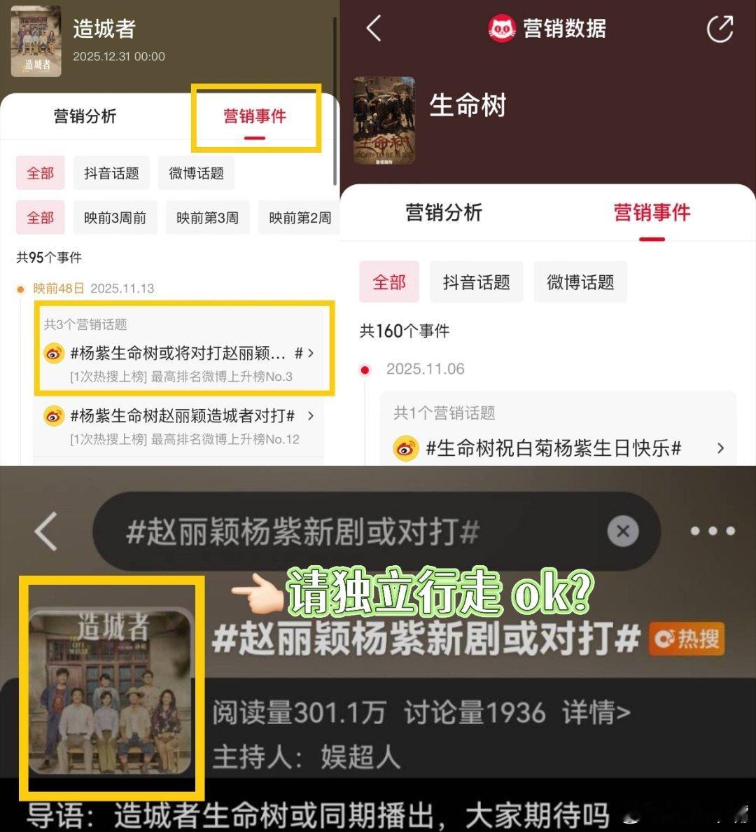 《造城者》和《生命树》营销事件数据对比!我不信丽丽已经沦落到蹭《生命树》营销了吗?其实也正常!《造城者》这剧做成喜剧个人感觉不伦不类,档次低了很多啊!是时候捆绑一部高厚度的剧集《生命树》来提升自己的品质了!这个yx做的很妙!《造城者》在yx这方面还是很牛的!期待播出!各方面数据肯定很不错!