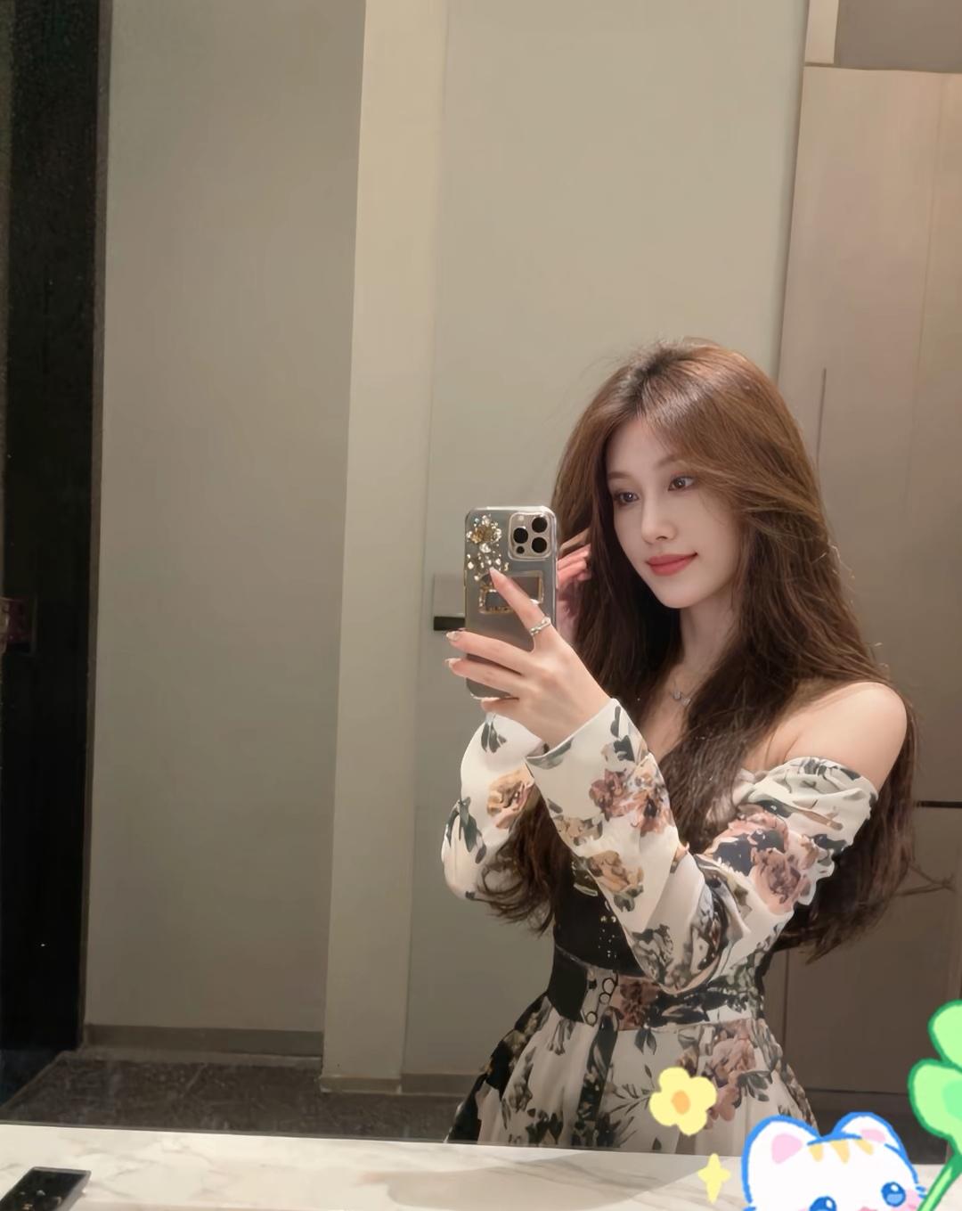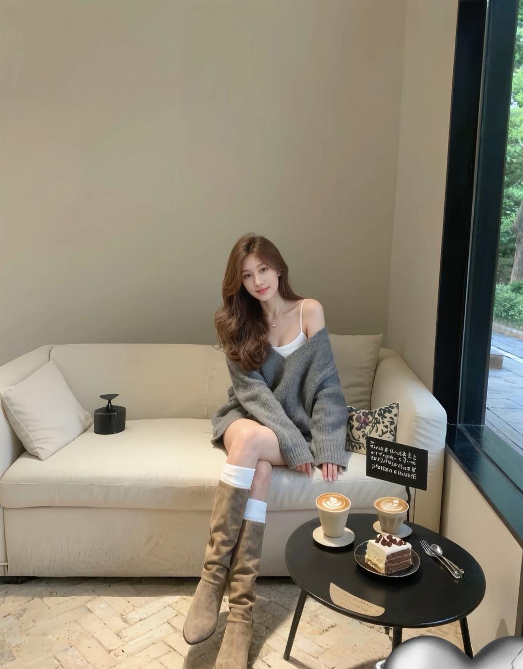 一袭裸色修身裙勾勒苗条曲线,米白开衫轻抚肩头添几分柔婉,粉色凉鞋与白色腋下包碰撞