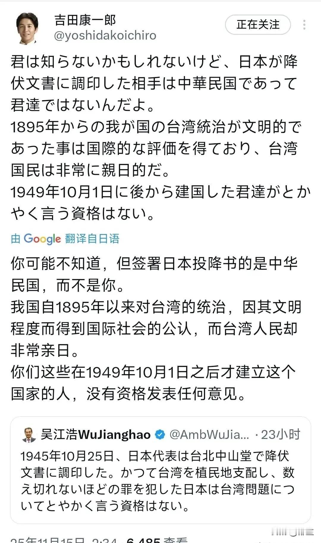 看了日本人近日来的操作,更加佩服左宗棠对日本人的评价,左公这段话说是这样说的:“知小礼而无大义,拘小节而无大德,重末节而轻廉耻,畏威而不怀德,强必盗寇,弱必卑伏!”虽然字不多,但是评价日本人完全到位,完全正确,盖述精准。 日本人现在对台湾还不死心,首相高市早苗更是妄言“台湾有事,不排除以武力干预”,这是赤裸裸的在挑衅中国。 更有日本日极右翼议员吉田康一表示:“我们中华人民共和国是在1949年10月1日之后才建立的,说我们这个国家的人,没有资格发表任何意见”。 这简直是一派胡言,不知廉耻!一个小小的日本国就敢这样挑衅一个大国,就是有美国为它撑腰,如果我们像美国一样轰炸它们,不讲仁义道德,它们保障就不会敢叫嚣了。也因为我们我们从来没有打击过它们,才让这种畏威而不怀德的国家在叫嚣。 日本首相,还有日极右翼议员的这些说词,无疑是在给自己找不愉快,强词夺理掩盖事实,完全中了重末节而轻廉耻的几个字。 他们越叫嚣得欢,越要干预中国台湾省之事,只会加快我们统一台湾的进程。