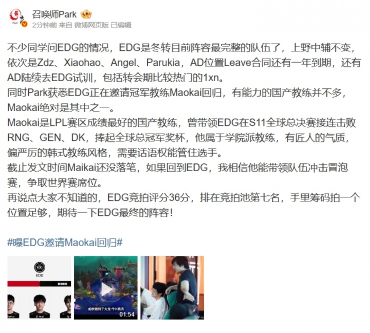 同时Park获悉EDG正在邀请冠军教练Maokai回归,有能力的国产教练并不多,Maokai绝对是其中之一。