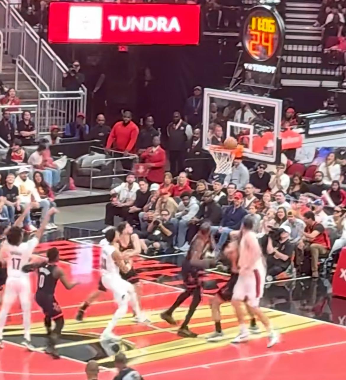 比赛第四节,开拓者球员夏普在球迷的干扰下两罚全丢。