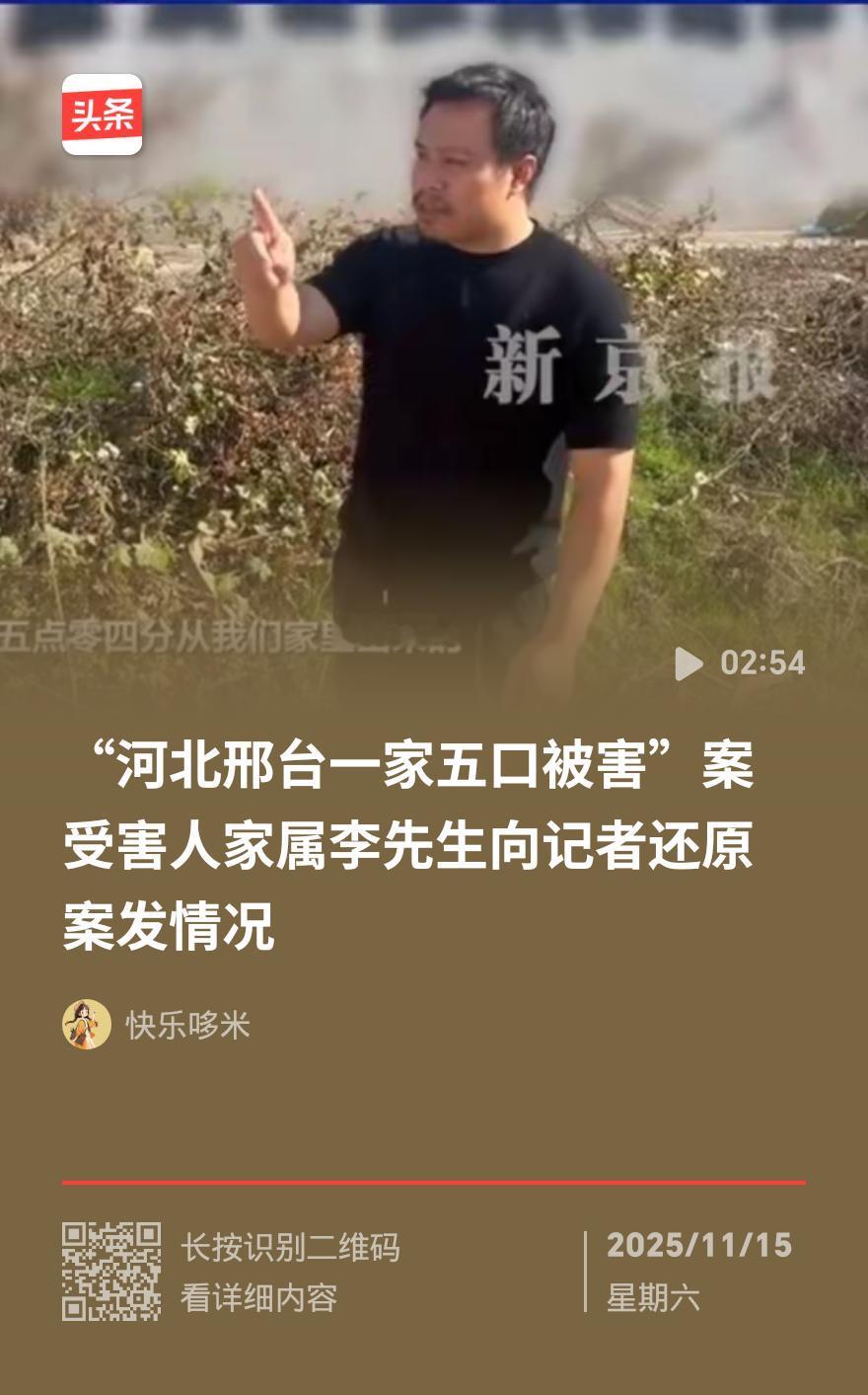 家人们!河北邢台那起一家五口被杀的惨案,真相真的让人脊背发凉!被害人家属李先生一开口,谁能想到,这场灭门悲剧的根源,竟然是1.5米宽的地方? 说出来你可能都不信,争执的核心就是一条原为水渠、现在当公共通道的小路,宽才1.5米,再加上宅基地盖房的边界拉扯。本来都是邻里间低头不见抬头见的事儿,可范某某浇地的时候,水流直接浸到了李家的墙根,时间一长,房子都受了损!这事儿换谁心里都有气,可谁能料到,就这么点芝麻绿豆的摩擦,居然一步步闹到了不可收拾的地步! 1.5米啊!也就两步路的距离,怎么就成了要命的鸿沟?老话说“远亲不如近邻”,邻里之间本该互相帮衬,就算有矛盾,坐下来好好说、各退一步,不就能解决了?房子坏了能修,利益有分歧能谈,可五条活生生的人命没了,再也回不来了! 李先生讲这些的时候,声音都带着哭腔,那份失去亲人的痛,隔着屏幕都能感受到。一场灭门血案,说到底就是执念在作祟,是沟通的缺席,更是情绪的失控!生活里谁还没个邻里纠纷、利益冲突?可逞一时之快,用极端方式解决问题,最后只会让多个家庭碎成片,万劫不复! “退一步海阔天空”真不是随便说说的大道理!1.5米的通道,本该是邻里和睦的见证,结果成了悲剧的导火索。希望这起血案能给所有人敲个响钟:邻里相处多份包容,遇事儿多份理性,别让一点小事,毁掉好几家人的一辈子!灭门悲剧 灭门慘案 灭门惨事 农村灭门案