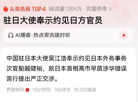 可能很多人不明白什么叫做“奉示召见”,一般来说,“奉命召见”这个词是很常见的。但其实“奉示召见”,这个词汇太强硬了,我们很难在这些年的外交场合里看到。     这一次,中方驻日本大使吴江浩就是奉最高指示,直接召见了日本外务省事务次官冈野正敬。这不是例行性的部门交涉,而是带着国家最高领导层的意志,传达一份必须正视的警告。   起因是日本政客高市早苗最近针对中国发表了一连串错误、带有挑衅意味的言论。这些话已经触碰了中国明确划定的底线,也让中日关系蒙上了阴影。     要知道,在外交系统里,“奉命召见”是外交部或上级部门的指令,很常见,但“奉示召见”不同,它代表的是由最高决策层直接下达的指令,这种信号极为罕见,也意味着事态已经升级到非常严重的程度。   近些年国际外交中几乎看不到它的身影,所以一旦出现,就等于是宣布事情到了关键阶段。     这次的召见,不只是简单的抗议,而是一种最高级别的严正交涉,从外交层级来看,已经没有再往上升级的空间,通过这种方式给出的警告,已经是最后的语言表达。   如果日方继续无视,特别是像高市早苗这样的人继续在错误的路线上走下去,那么双方用言辞解决问题的可能性将终止,接下来就只能用其他方式应对。     对中方来说,台湾问题是核心利益的核心部分,是绝对不能被挑战的红线,任何外部势力在这一问题上挑衅,都必然面对坚决反制。   日本如果选择一意孤行,把自己推到地缘冲突的第一线,那么它面对的将不只是一个“俄罗斯”,而是更为坚定、不会在核心利益上退让的中国。     东亚的格局不同于欧洲,历史矛盾和现实力量的分布让局势更加复杂,如果日本政界有人真想把自己变成区域对抗的触发点,那就要承受由此产生的全部后果。   这不仅会影响它本国的命运,还可能推动整个区域的战略变化,历史上,很多重大转折都是由一次错误的挑衅引发的,现在的信号已经很明确,是否悬崖勒马,就看日方的选择了。