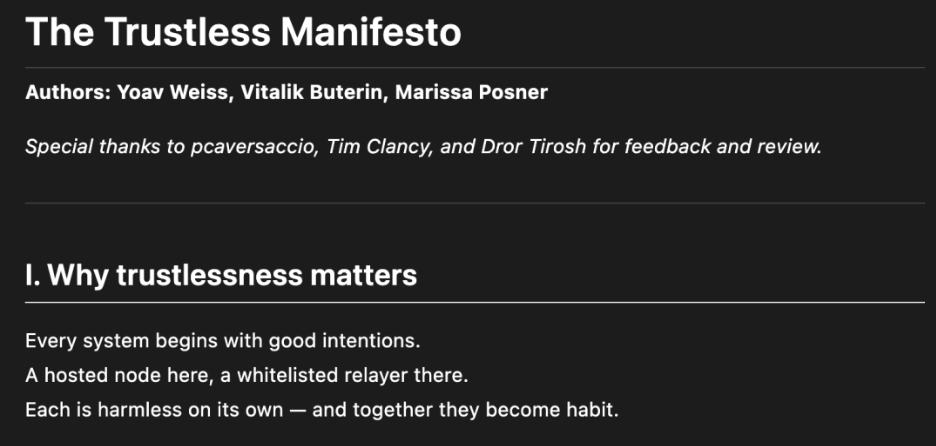 2025年11月13日,以太坊联合创始人VitalikButerin与YoavWeiss、MarissaPosner共同签署并发布《无需信任宣言》(TheTrustlessManifesto)。