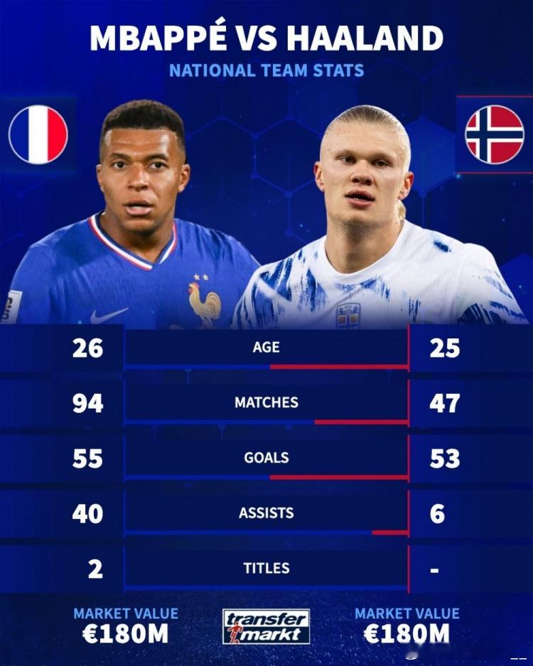 德转对比国家队数据:梅西(38岁)比赛——196进球——115助攻——64冠军——4德转身价——1800万欧==================C罗(40岁)比赛——226进球——143助攻——46冠军——3德转身价——1200万欧==================姆巴佩(26岁)比赛——94进球——55助攻——40冠军——2德转身价——1.8亿欧==================哈兰德(25岁)比赛——47进球——53助攻——6冠军——0德转身价——1.8亿欧==================