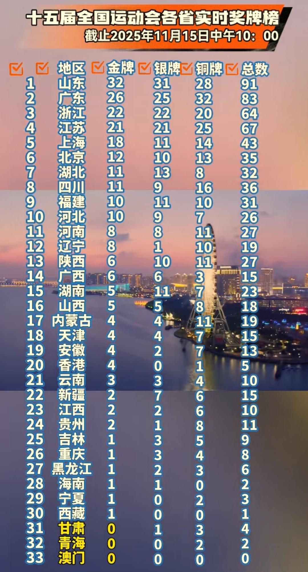 还是要恭喜重庆与黑龙江,最近几天终于拿得到了全运会金牌,这样的话它们就结束了没有拿到金牌的尴尬窘境。 广东虽有主场的天时地利人和,不管是男篮还是女篮都战胜了辽宁,可是金牌数量广东省还是比山东省少一些。 这样看来山东省不仅是北方地区体育基础最雄厚的省份,同时也是我国体育人才储备最丰富的省份,见此情景不禁感慨广东很有可能要继续成为千年老二。 稍微有些遗憾的是截至目前辽宁省的金牌数量还是没有到达10个,希望接下来的比赛能有好的发挥。