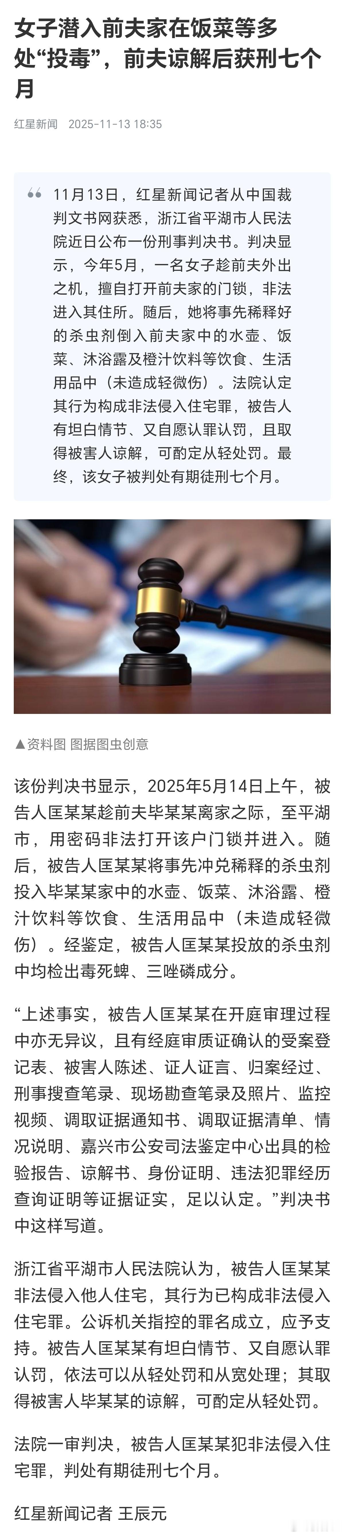 这个案子的判决,感觉好奇怪。今年5月14日,云南一女子趁前夫外出之际,用密码非法潜入前夫家,并将事先稀释好的杀虫剂,投入前夫家的水壶、饭菜、沐浴露等饮食、生活用品中。经鉴定,女子投放的杀虫剂中,均检出毒死蜱和三唑磷成分。法院审理后认为,女子非法侵入他人住宅,已构成非法侵入住宅罪,因有坦白情节,又自愿认罪认罚,且取得被害人谅解,最终获刑7个月。我不太明白。是因为投放杀虫剂这块,没造成实际伤害,所以就没有对应刑责吗?