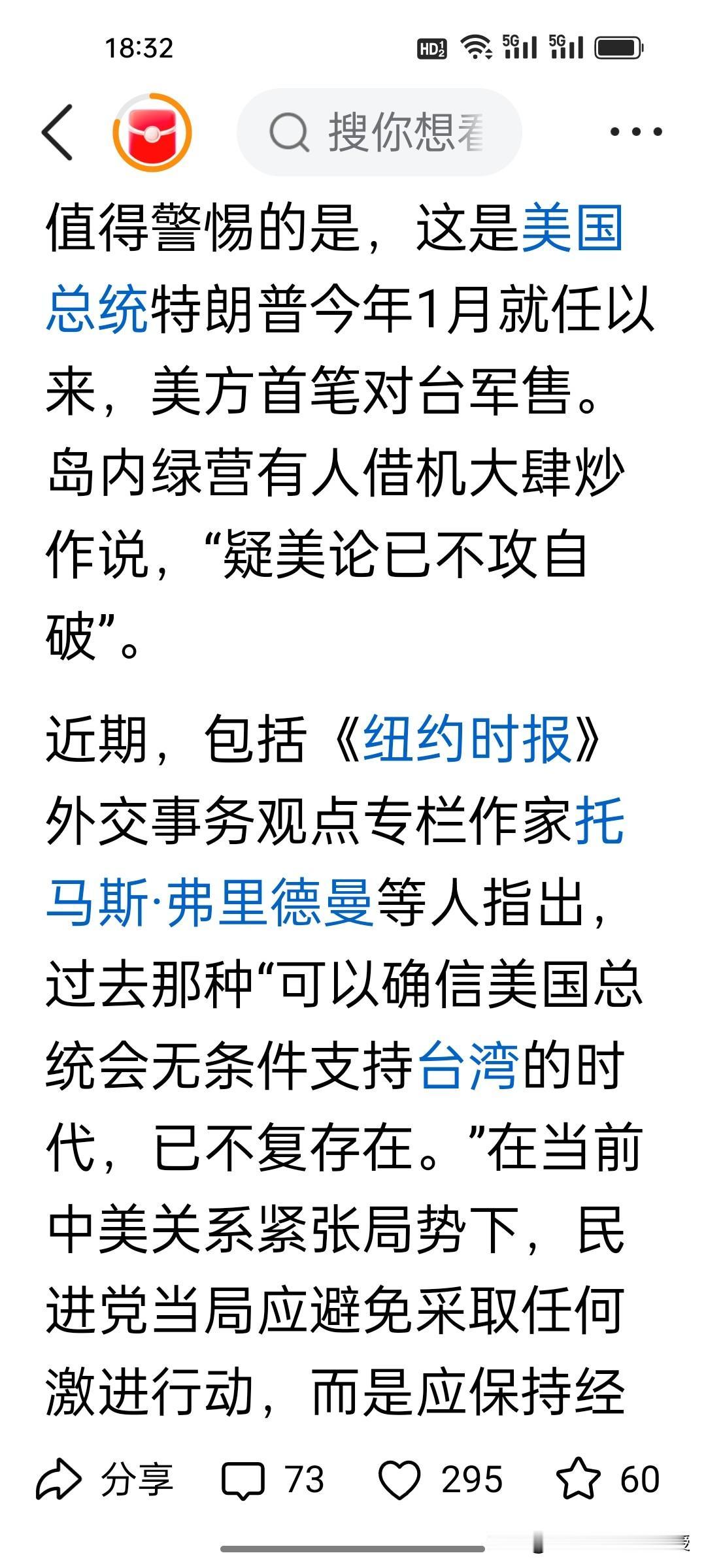 特朗普翻脸果然比翻书还快!满脑子就是做生意赚钱。根据《观察者网》消息,特朗普前脚对高市早苗涉华言论划清界限,吐槽日本一直在贸易上占美国便宜,盟友算不上朋友,跟中国关系好,后脚又开始向台湾出售3.3亿美元的战斗机零部件,这是特朗普第二个任期内的第一笔向台军售。 台湾近期已经答应在美投资3500-5000亿美元,11月底之前就要敲定协议,且大概率不包含台积电已经在美国投资的1650亿美元,台湾甘愿这样被美国“压榨”(跟要求日本在美国投资金额相同)就是为了不要给台湾半导体产业再加关税。 台湾对美国可以说是“倾家荡产式”投资,现在可能还要帮美国“清库存”,要再花3.3亿美元买美国的战斗机零部件,这真的要掏空家底啊! 特朗普一边喊着“与中国关系好”,是好朋友,一边拿对台军售当摇钱树,虚伪贪婪的嘴脸暴露无遗。台当局至今不知悔改,掏空家底媚美求存,既挡不住历史大势,还让台湾民众为其错误决策埋单,实在愚蠢又可悲!