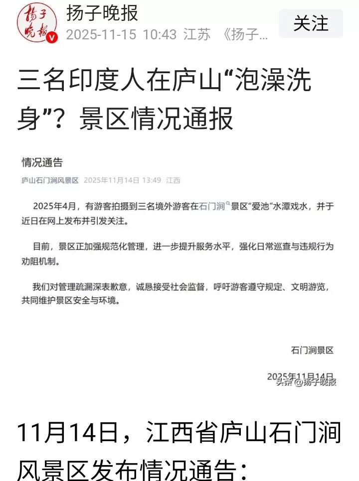 三名印度游客在庐山石门涧景区的爱池洗澡。 11月14日,石门涧景区管理处就印度游客违反规定在景区爱池洗澡一事,向媒体和公众致歉,承认因疏于管理,致使印度游客在景区爱池内洗澡。 事件起因于今年四月,印度游客在石门涧景区游玩时,拿上景区应急用的游泳圈及其他设备,下到景区爱池洗澡,这一场景被附近游客拍照并发布到网络上。当时有游客提醒这三名印度游客不要在池里洗澡,但他们我行我素,不听劝告。彼时,爱池边上有英汉双语提示“不许下池洗澡”,可印度游客却置若罔闻。 近期,印度游客在各地游玩时屡屡违反规定、破坏旅游环境,此类事件频频发生,引发国内游客对其违章行为的不满,也引起了各地景区的高度关注。