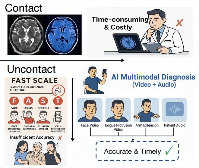 当前主要存在两类诊断路径:一是接触式诊断,比如做CT或磁共振成像扫描,即给大脑拍一张超级详细的照片。但这必须去医院,而且过程很慢,容易错过黄金时间。二是非接触式诊断,比如通过采用FAST量表,并由医生观察患者的脸部、手臂和语言情况来判断。这种方法虽然快,但是准确率不高,尤其当患者是老年女性时,而检查处于躺卧姿势的患者时误差甚至会更大。由于脑卒中救治每延迟5-10分钟就可能造成不可逆的损伤,因此现有流程存在明显不足。