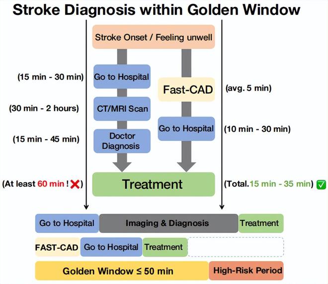 如前所述,这项研究源于一个与人们日常生活紧密相关的现实问题——脑卒中,即俗称的“中风”。研究动机始于沙天铭身边人的亲身经历,这让他深刻意识到:首先,脑卒中是一种发生在人们身边且相当普遍的疾病;其次,公众对脑卒中的认知水平普遍不足,而现有的诊疗方法未能充分重视其时间敏感性这一关键特征。