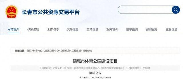 11月12日,长春市公共资源交易平台发布德惠市体育公园建设项目招标公告,重点内容如下: