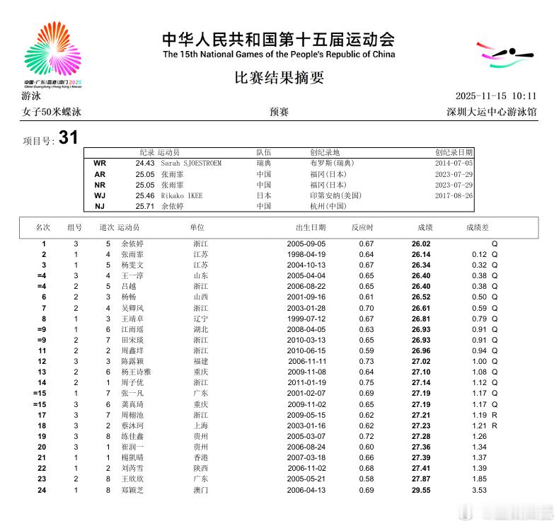 张雨霏全运冲金又一力项来到! 50蝶预赛从容第二 余依婷抢占先机第一11月15日上午,全运会游泳大项结束女子50米预赛争夺,浙江选手余依婷26秒02排名第一。余依婷第三小组出场,对阵今年世锦赛该项目杀入半决赛的山东选手王一淳。预赛这场,余依婷优势明显,以26秒02的强势发挥拿到第一,王一淳26秒40小组第二。该项目亚洲纪录保持者、江苏选手张雨霏在第一组早早现身。她也给出26秒14的不错发挥,拿到小组第一,江苏队队友杨雯文26秒34小组第二。今年全国冠军赛冠军、浙江选手吴卿风第二小组有所保留,只以26秒61列小组第三。队友吕越26秒40小组第一。预赛总排名余依婷第一,张雨霏第二,杨雯文第三,吕越第四,王一淳第五,杨畅第六,吴卿风第七。半决赛将在今晚20点15分和20点20分陆续展开。