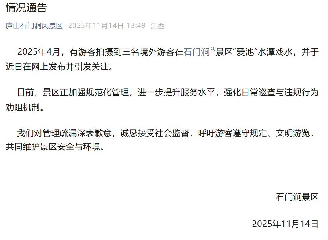 无语!3印度籍男子闯庐山禁地泡澡,打肥皂+挪用救生圈。 庐山石门涧景区的视频彻底点燃全网怒火!3名印度籍男子无视岸边醒目的“禁止下水”警示牌,直接脱衣跳进“爱池”山泉水潭搓澡嬉戏,不仅用香皂搓洗导致水面浮起大量泡沫,还把应急救生圈当成玩具把玩,离开时更是留下香皂盒等垃圾,完全把公共景区当成私人浴场。 更气人的是,现场有中国游客多次上前劝阻,可3人全程无动于衷,直到景区工作人员赶来前匆匆逃离。要知道,这片山泉水是脆弱生态载体,当地人连洗手都格外谨慎,肥皂水残留可能污染水体、危害水生生物,而水下岩石湿滑,此前还发生过游客溺水事件,挪用救生圈无疑给他人安全埋下隐患。 事件曝光后,庐山石门涧景区于11月14日致歉,承认巡查疏漏,但仅表示会加强巡查、增设英文警示牌。 目前,景区已通过监控和酒店登记锁定涉事者,移交出入境管理部门处理,但处罚结果仍未公开。旅游的底线是尊重规则,无论国籍肤色,破坏生态、漠视安全的行为都该被追责。 你觉得该如何处罚这3名外籍男子?快来评论区聊聊~ 庐山游泳 庐山旅游文案