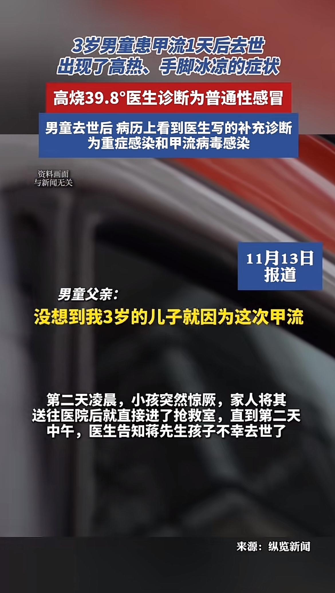 河南濮阳这事儿太让人痛心了。11月10日凌晨,3岁男童高热、手脚冰凉,去急诊时高烧39.8度,医生诊断普通感冒,开了药就让回家。结果第二天凌晨孩子惊厥,送医进抢救室,中午就不幸去世,病历补充诊断是重症感染和甲流病毒感染,家长觉得是误诊。 其实甲流危险真不能小瞧,杭州也曾有9岁男孩感染甲流,发烧1天后肺部大片变白进了ICU。目前当地多部门已介入调查。家长以后碰到孩子精神不好、高烧不退,真得赶紧重视起来,希望调查能给家长一个公正结果。