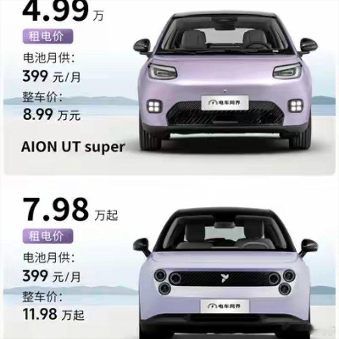 请理性,这个车不是五万。广汽埃安生产,宁德换电,京东销售。广汽的营销不足,宁德把电池加入,有技术和资金托底,京东本来就是商业性的,可以把营销售后做好,这就是所谓的强强联合吧。各自都干各自擅长的。我看有网友说应该叫广汽宁德京东汽车,简称“汽德隆东强”汽车,文雅响亮!哈哈,开玩笑。,看到好多人都说这个车是5万块就能买,请理性,请冷静,这个车不是5万,这还是9万的车。我相信买完这个车之后,不打算三五年换车的情况下,更多人三年之内会买断电池。说是5万买车,从价值方面换个方式来讲其实就是三年免息。,我感觉这次的卖点就是巧克力换电吧,但是刚一查,巧克力换电还得太少了,所有站点只有大城市有,而且是一线大城市, 省会城市就四五个 ,小城市买是几乎不可能了 ,租赁模式就是买了个金融租赁的电车,首付50%,每个月月付400 。主要现在5万块钱,还真没有什么能买的小车,所以家用的话用个租赁模式也不是不行。如果你找不到换电站,那就不合适了,如果你想离着巧克力换电站特别近的那更好哈。,换电有一个好处。不仅仅电池不好用的时候随时可以换一块,更重要是驾驶中万一电池发生意外剐蹭,车和电池分离,不影响第二年保费。而且就算刮到了电池也不用你负责,这一点是家用电车的痛处。。对比一下年初的埃安ut吧,其实跟之前埃安UT智豪版几乎是一模一样的。420智豪版卖过8.98。那这两款车的功能属性配置也几乎完全一样。变化方面,首先,电池升级到了54度的宁德时代的电池。续航里程由420公里升级到了500公里,支持了宁德时代的巧克力换电体系。再就是内置的华为的云车机。五百公里的续航,支持换电,不到9万的价格。基本属于升级不涨价吧。。有租赁和买断两种方案,买断和租电的价格差价是3万8。从第二年支持买断,三年内的租金才支持百分百的全额抵扣。你过了一年之后,你想买断随时就能买断。而且它等于是三年免息的,我觉得真的是挺好的。。这个小车其实我更看好租赁,我感觉特别适合预算不足的小年轻买,手头目前没那么宽裕,有换电加持,使用起来也更加的方便,偶尔有个远门的需求,有换电加持,也不至于被动。主要他没有换电的溢价,蔚来有明显的换电溢价就劝退了不少人。三年买断电池,没有额外金融费用,其实还是很合适的。