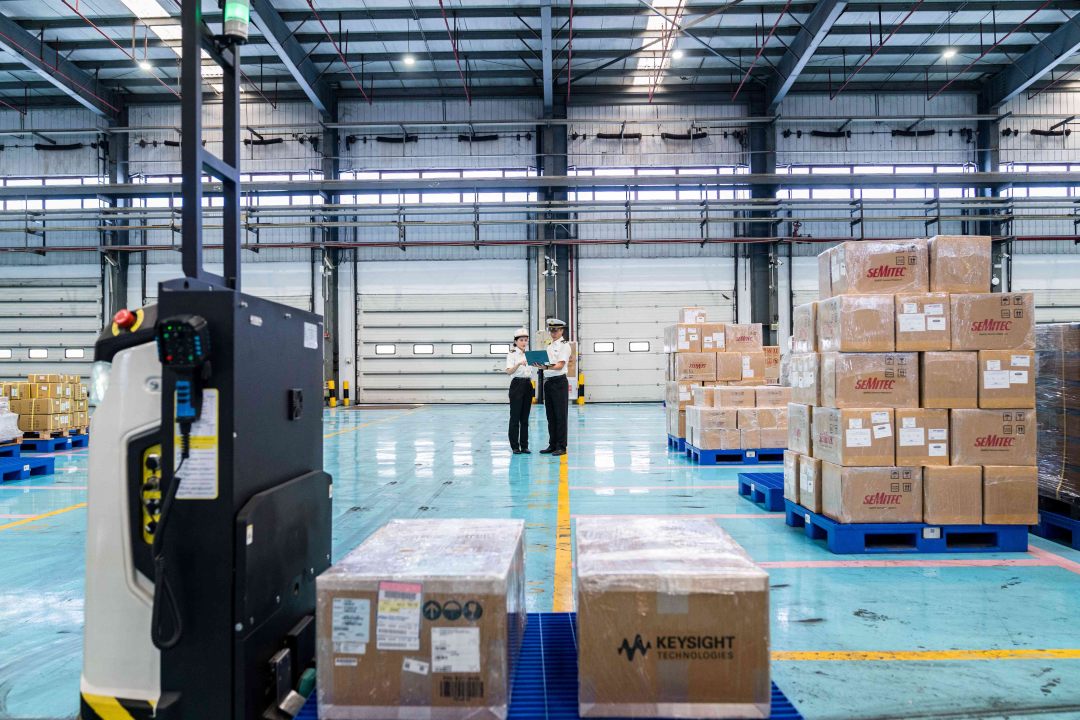 深圳宝安机场海关关员对机场深畅货站AGV搬运机器人运作情况进行实地巡仓检查。叶俊超摄