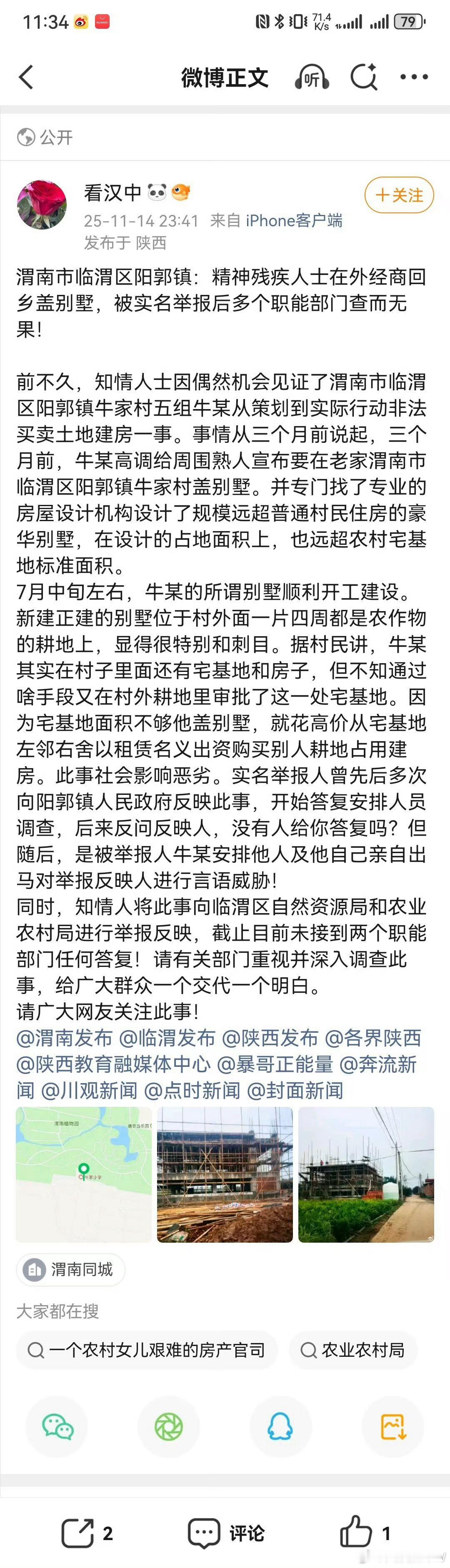 【网友质疑渭南市临渭区阳郭镇精神残疾人士在外经商回乡盖别墅,被实名举报后多个职能部门查而无果!】前不久,知情人士因偶然机会见证了渭南市临渭区阳郭镇牛家村五组牛某从策划到实际行动非法买卖土地建房一事。事情从三个月前说起,三个月前,牛某高调给周围熟人宣布要在老家渭南市临渭区阳郭镇牛家村盖别墅。并专门找了专业的房屋设计机构设计了规模远超普通村民住房的豪华别墅,在设计的占地面积上,也远超农村宅基地标准面积。7月中旬左右,牛某的所谓别墅顺利开工建设。新建正建的别墅位于村外面一片四周都是农作物的耕地上,显得很特别和刺目。据村民讲,牛某其实在村子里面还有宅基地和房子,但不知通过啥手段又在村外耕地里审批了这一处宅基地。因为宅基地面积不够他盖别墅,就花高价从宅基地左邻右舍以租赁名义出资购买别人耕地占用建房。此事社会影响恶劣。实名举报人曾先后多次向阳郭镇人民政府反映此事,开始答复安排人员调查,后来反问反映人,没有人给你答复吗?但随后,是被举报人牛某安排他人及他自己亲自出马对举报反映人进行言语威胁!同时,知情人将此事向临渭区自然资源局和农业农村局进行举报反映,截止目前未接到两个职能部门任何答复!请有关部门重视并深入调查此事,给广大群众一个交代一个明白。 请广大网友关注此事!抄送 核查!