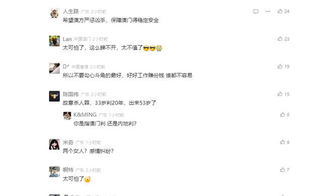 这起恶性案件引发了网友的广泛关注和热议。许多网友表达了对受害者的同情和对凶手的愤慨。来自广东的网友“人生路”表示:“希望澳方严惩凶手,保障澳门的稳定安全。这起案件性质太恶劣了,必须让凶手付出应有的代价,才能给受害者一个交代,也能维护澳门社会的安全稳定。”