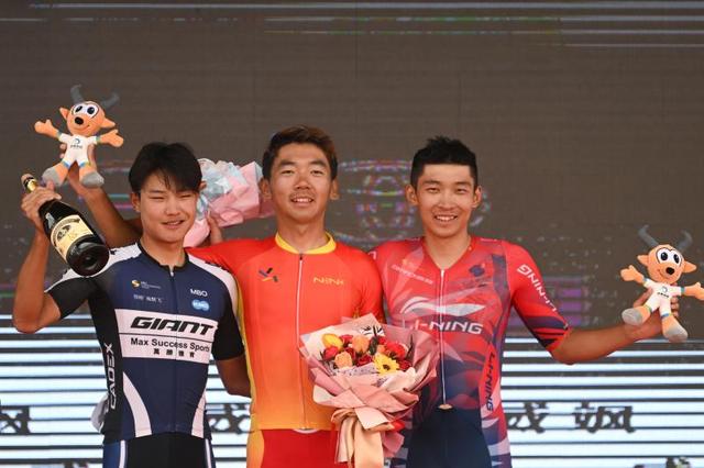 2022年7月31日,获得赛段前三的甘肃体彩队选手彭鑫(中)、捷安特洲际队选手吴俊杰(左)、李宁之星洲际队选手牛益逵在领奖台上合影。当日,第21届环青海湖国际公路自行车赛进行第五赛段青海湖景区至茶卡壹号·盐湖景区的角逐。新华社记者张龙摄