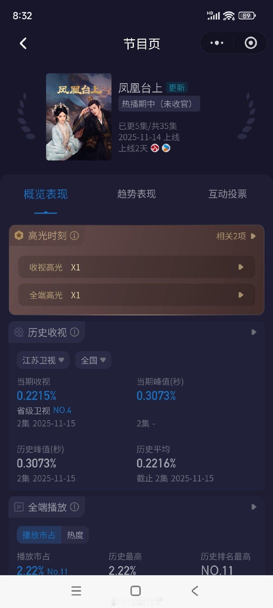 江苏卫视出息了,《凤凰台上》第2集,江苏卫视酷云收视率0.2215,峰值0.30