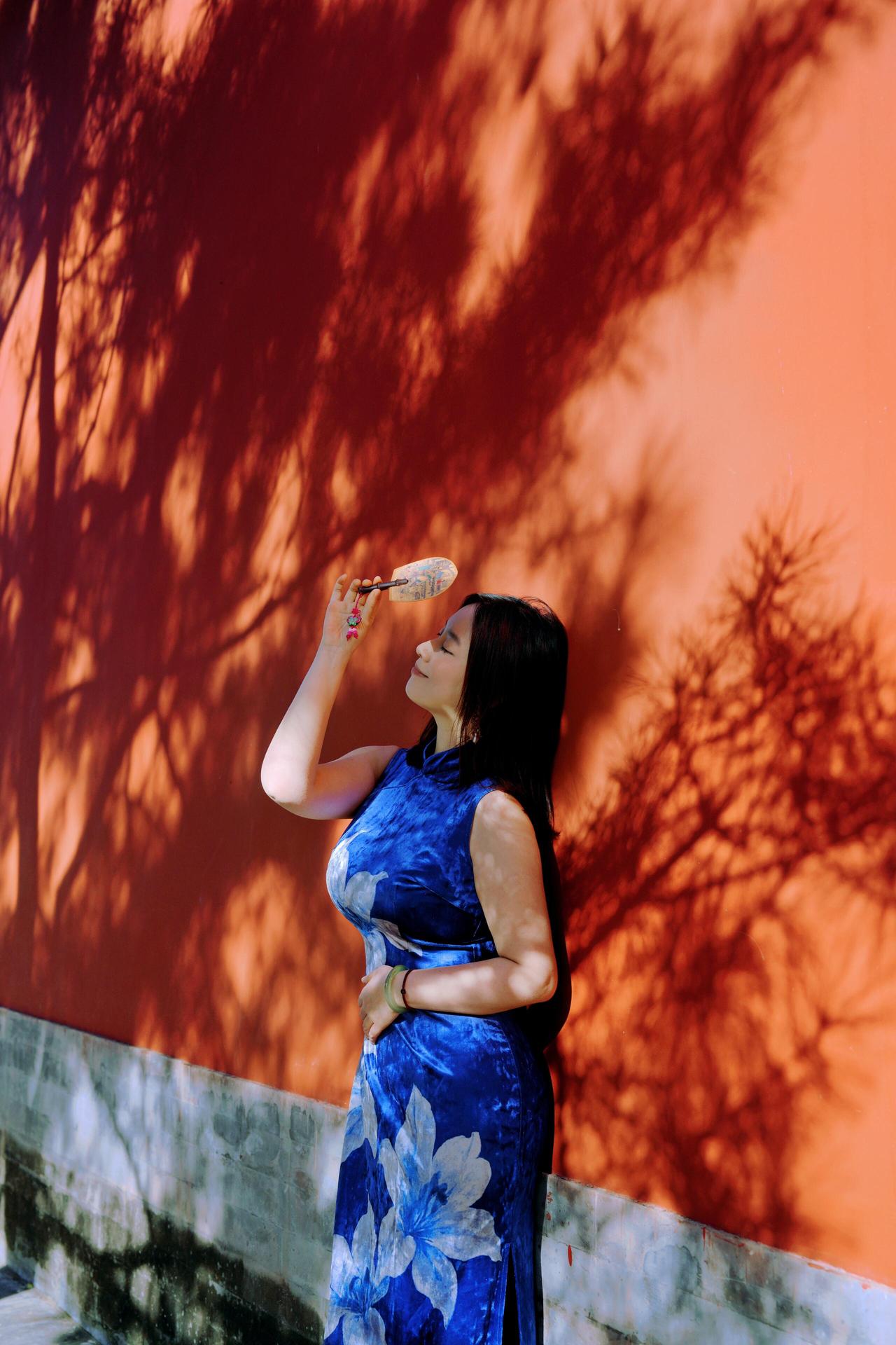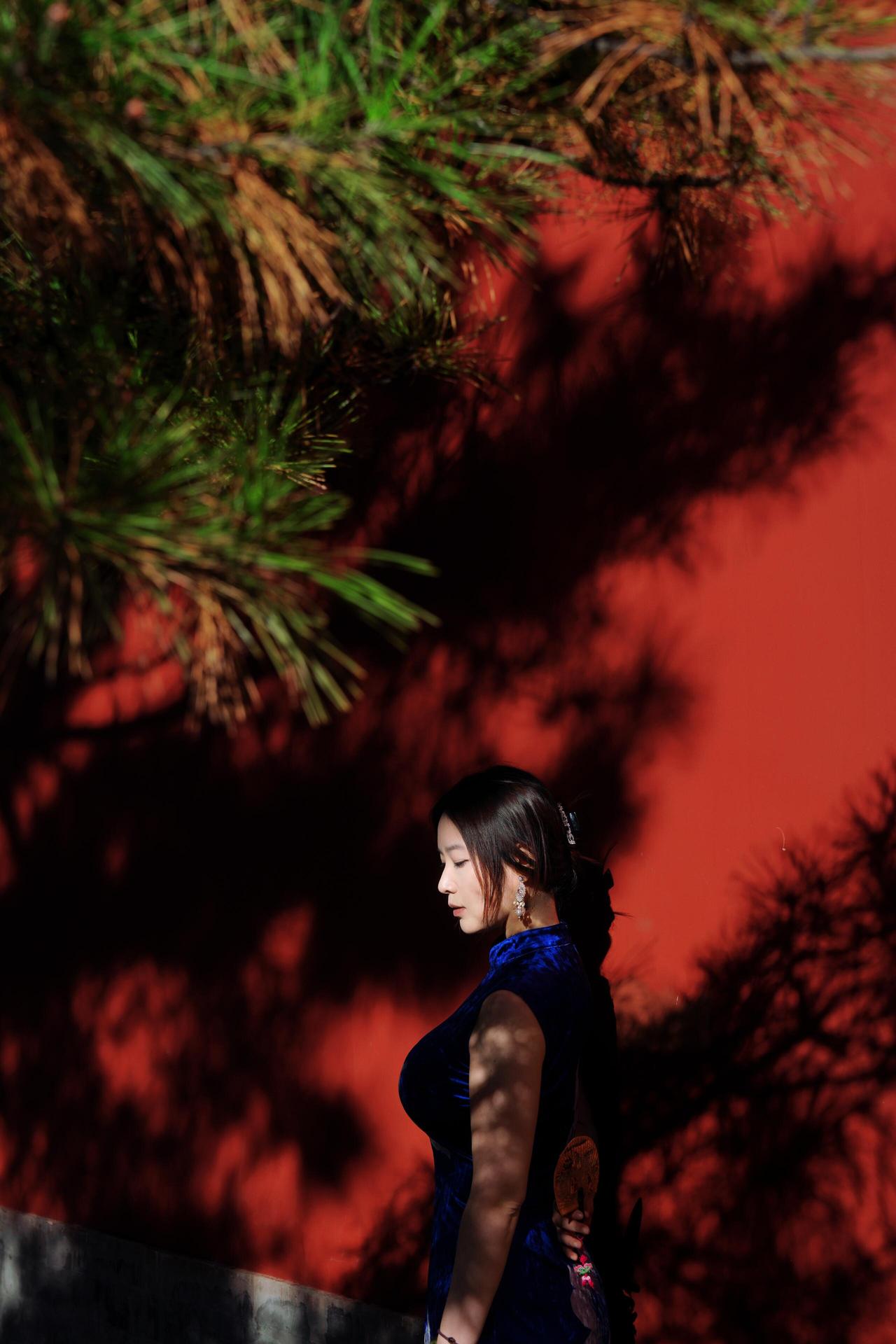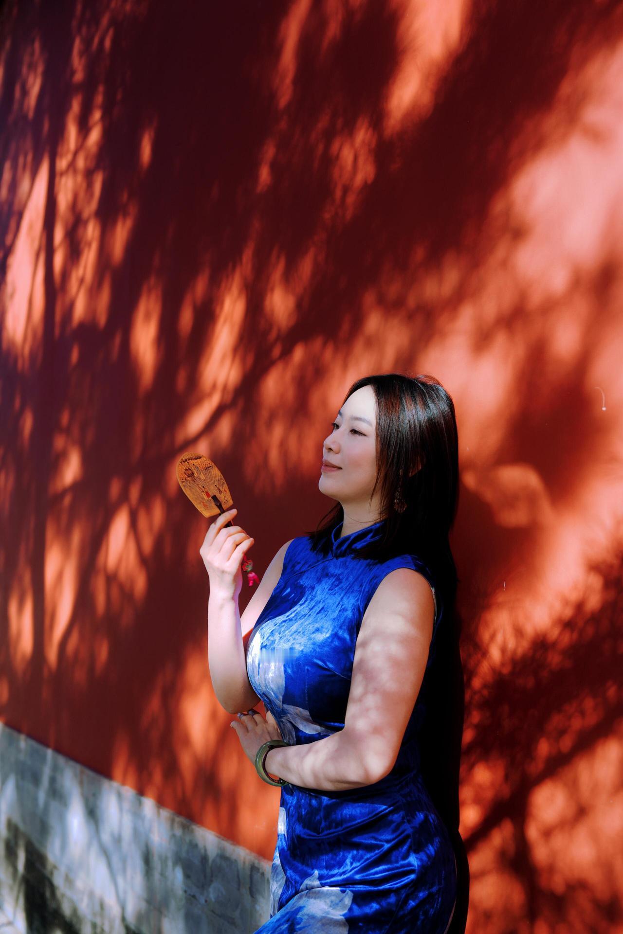 秋日暖阳斜斜淌下来,给斑驳的砖面镀上层柔光,几片银杏叶打着旋儿落在肩头,像谁递来的金色信笺。 宝蓝色旗袍的裙摆扫过草地,裙角绣着的银线在光下闪着细碎的光。让阳光穿过叶隙落在发梢,让银杏的金黄、墙体的朱红与旗袍的宝蓝在镜头里撞个满怀。