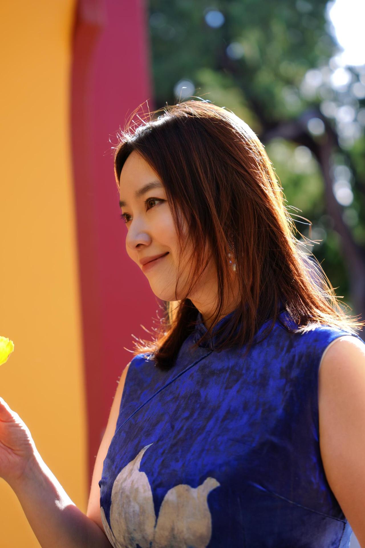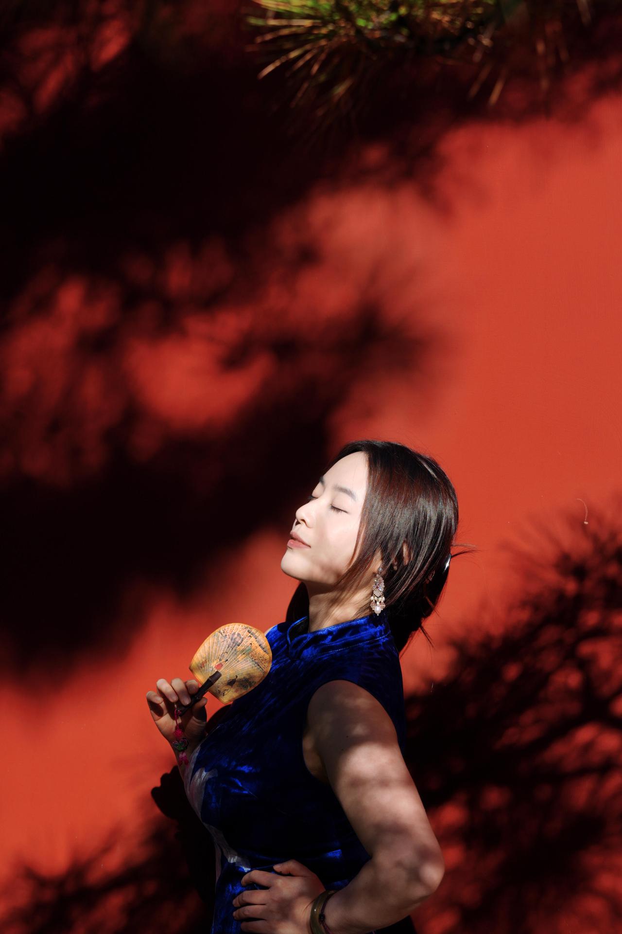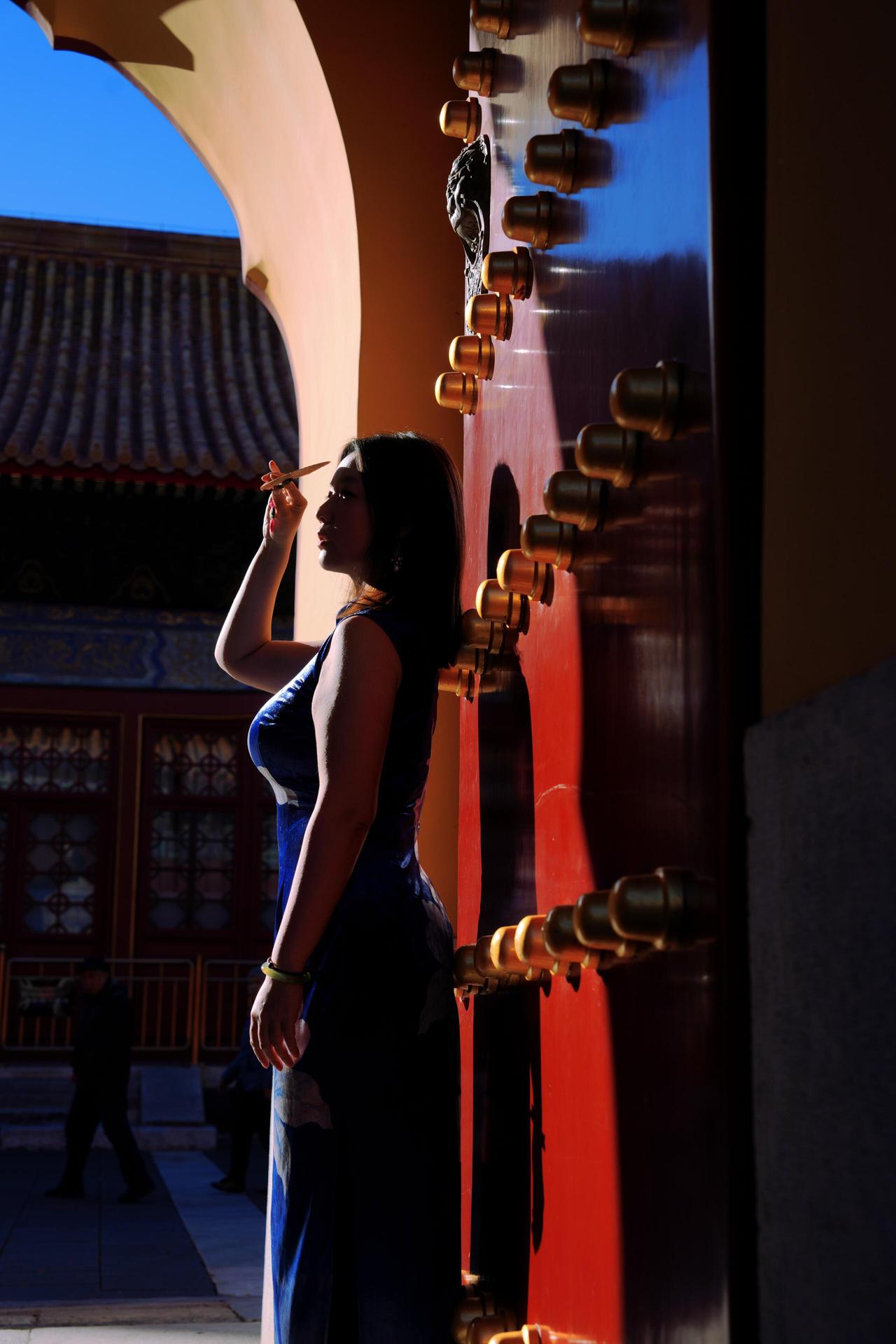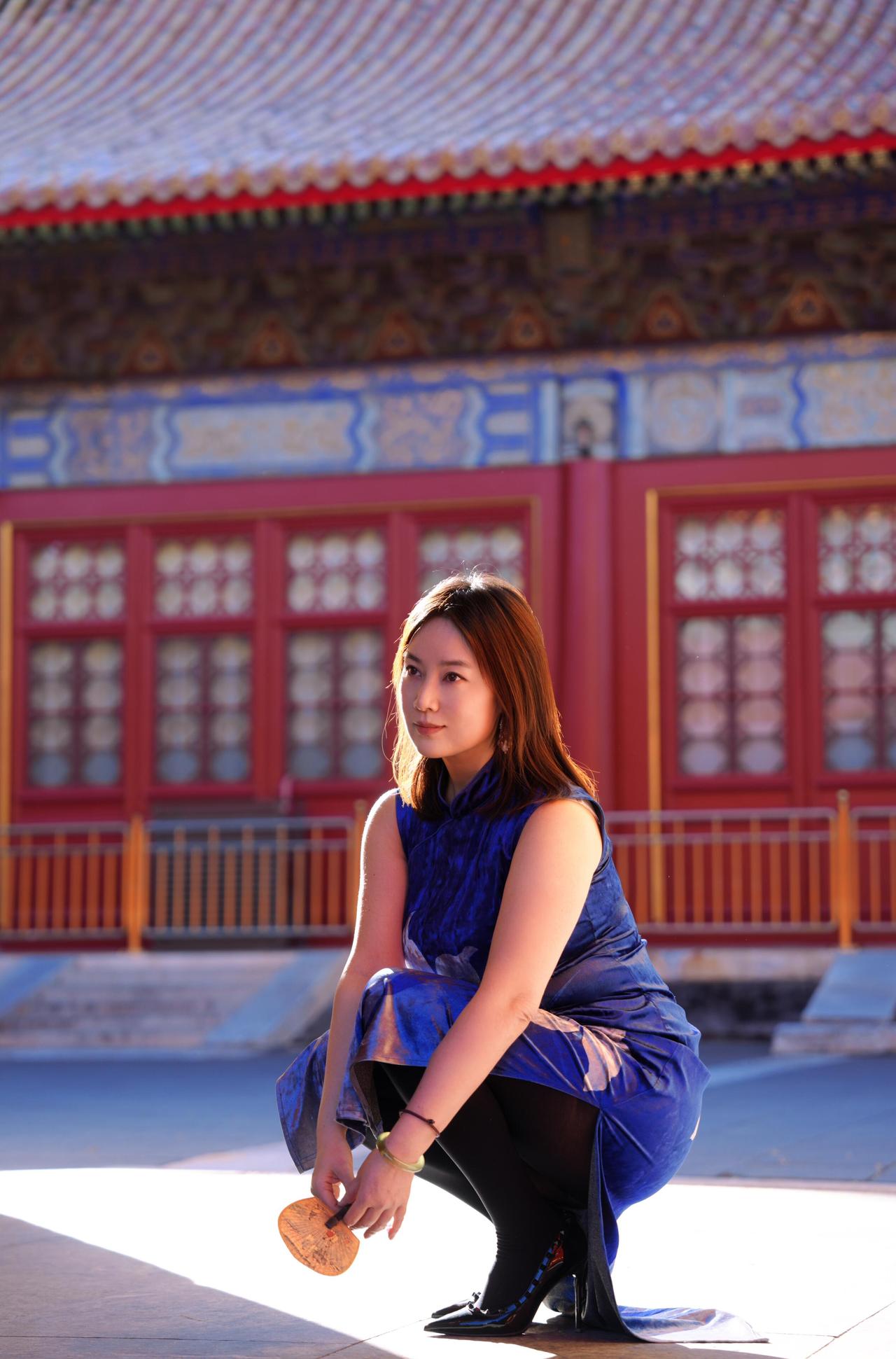 秋日暖阳斜斜淌下来,给斑驳的砖面镀上层柔光,几片银杏叶打着旋儿落在肩头,像谁递来的金色信笺。 宝蓝色旗袍的裙摆扫过草地,裙角绣着的银线在光下闪着细碎的光。让阳光穿过叶隙落在发梢,让银杏的金黄、墙体的朱红与旗袍的宝蓝在镜头里撞个满怀。